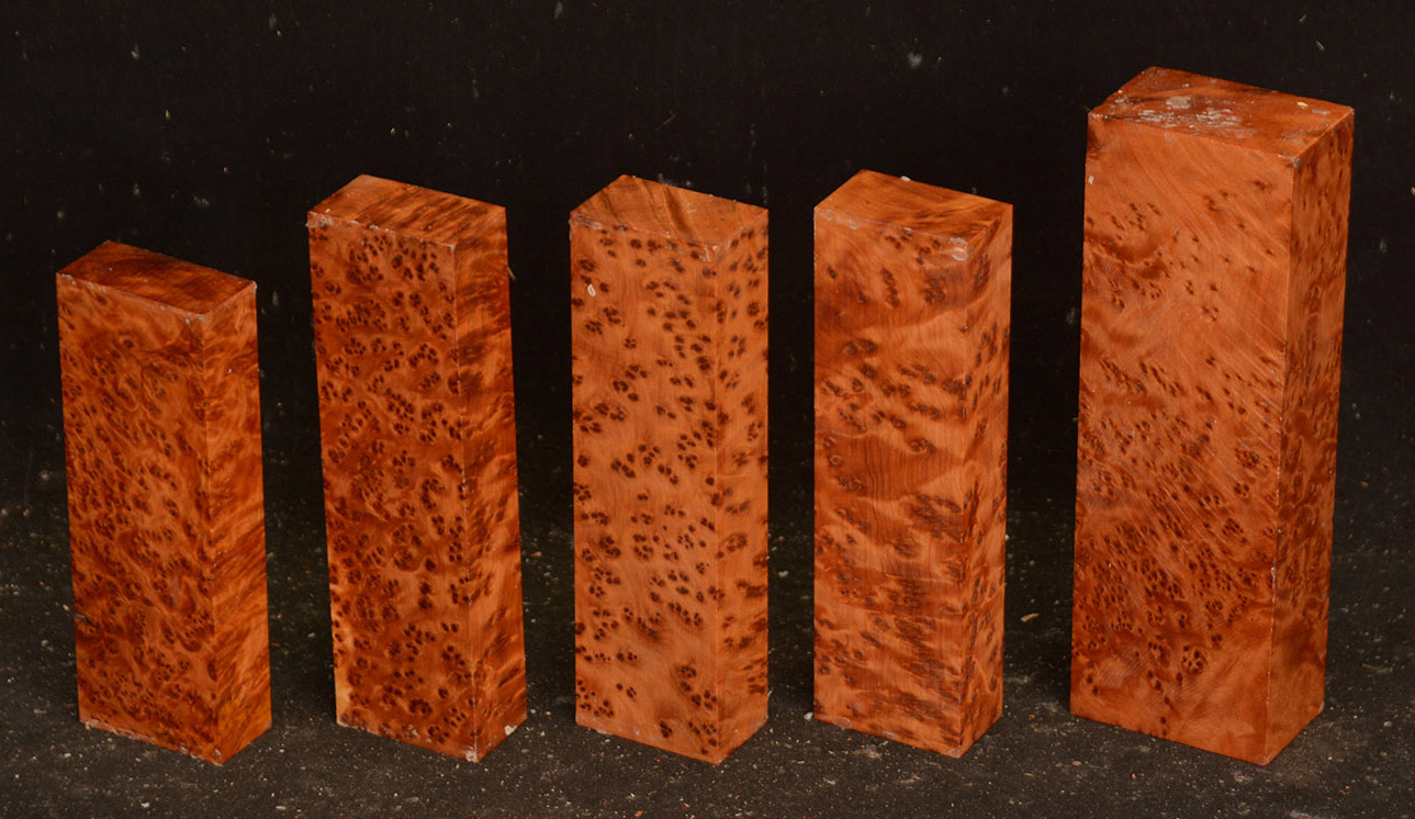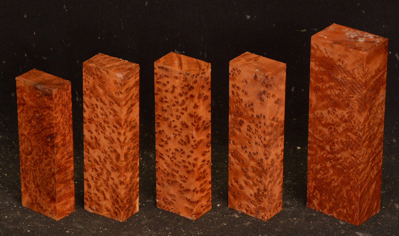 This comes from the Atlas mountains in Morocco and has a beautiful golden chatoyance. Its color varies from a rich, lustrous golden brown to nearly black. Thuya burl is hard and dense with a high oil content, but tends to be brittle. The eyes, perfectly round, are scattered about in some burls like the figure in bird's-eye maple; in others they are grouped as islands. Due to it's desert occurrence, the wood sometimes contains small defects or inclusions but most can be repaired with cyanoacrylate (super) glues. A rare species, this exquisite wood is used for inlays, small boxes, turnery, and precious objects.