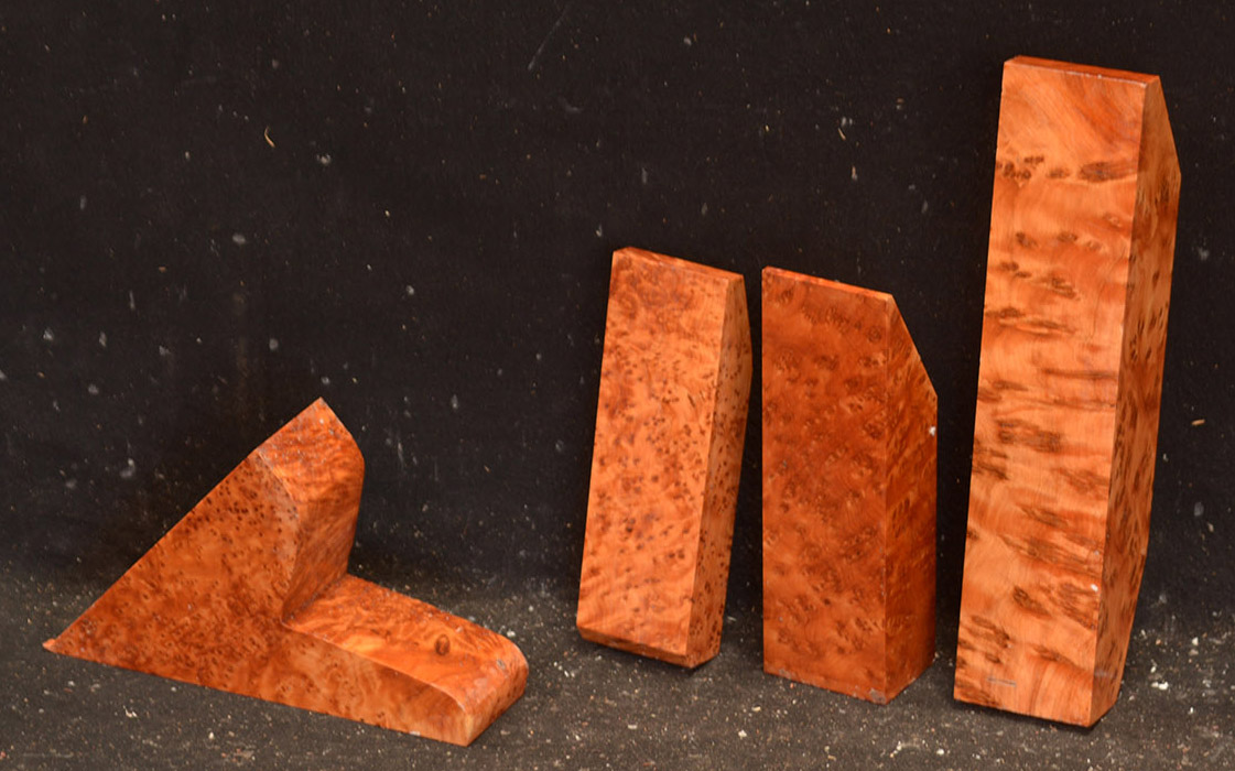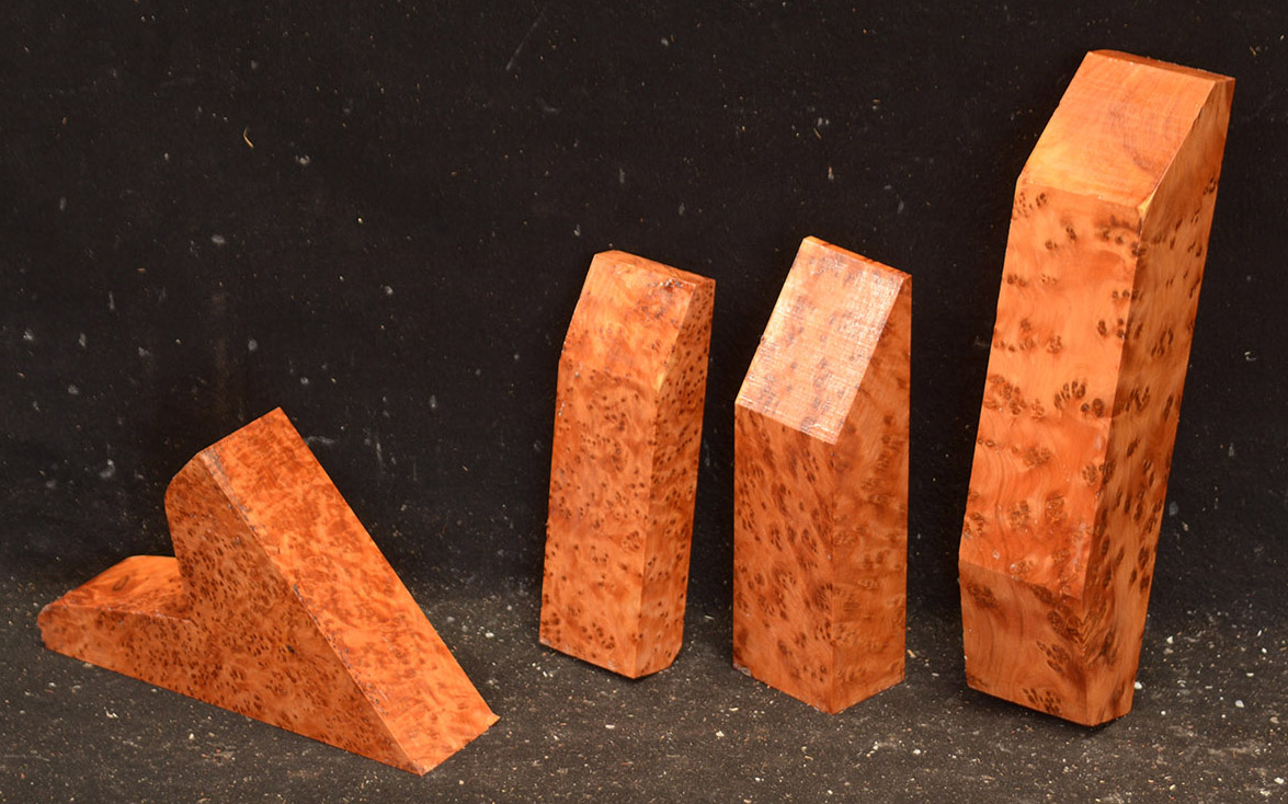 This comes from the Atlas mountains in Morocco and has a beautiful golden chatoyance. Its color varies from a rich, lustrous golden brown to nearly black. Thuya burl is hard and dense with a high oil content, but tends to be brittle. The eyes, perfectly round, are scattered about in some burls like the figure in bird's-eye maple; in others they are grouped as islands. Due to it's desert occurrence, the wood sometimes contains small defects or inclusions but most can be repaired with cyanoacrylate (super) glues. A rare species, this exquisite wood is used for inlays, small boxes, turnery, and precious objects.