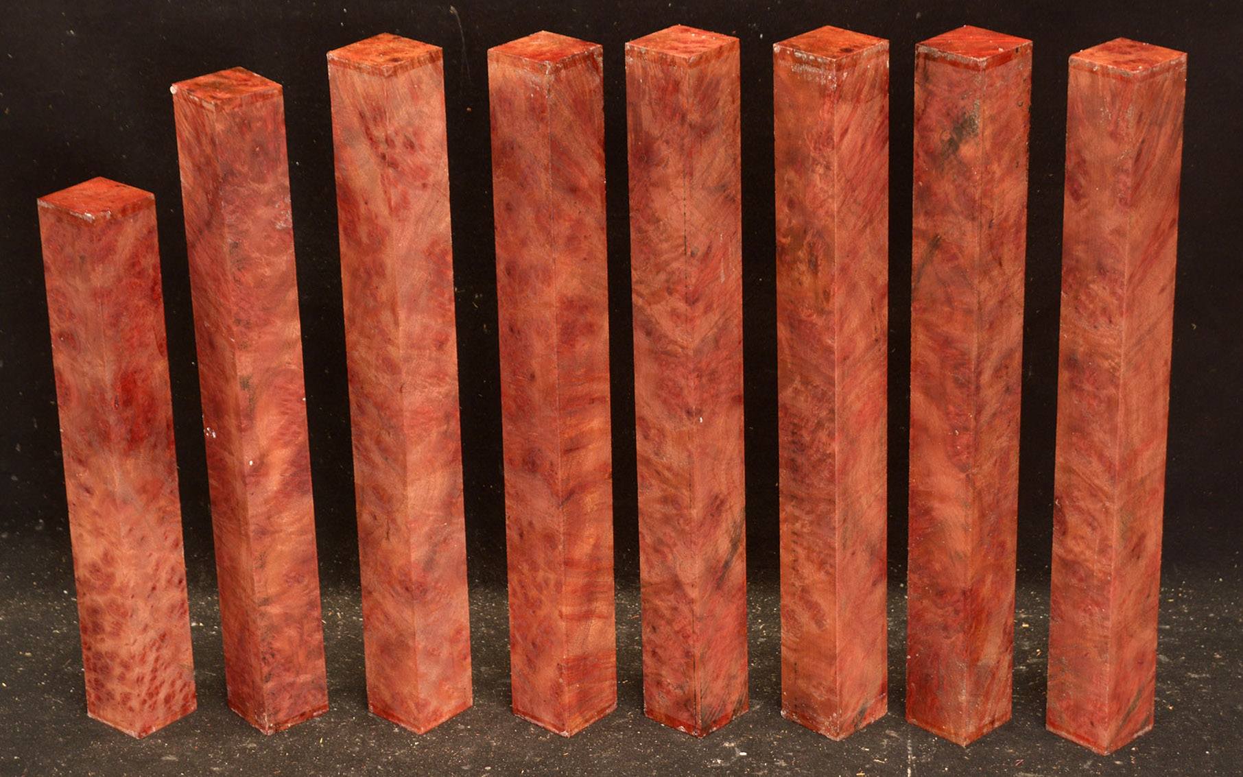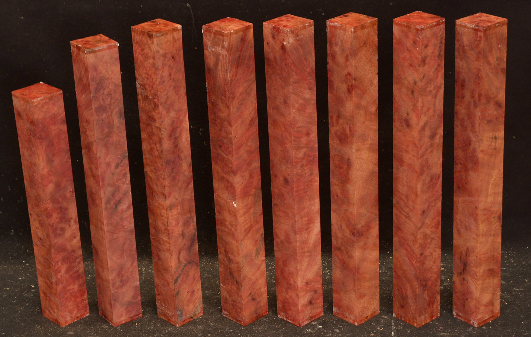 This rare burl is from S.E. Asia and is seldom seen on the world market. It is fine-grained and varies in color from a light reddish-brown to almost scarlet. It is easy to work and has a very pungent, spicy scent. For a burl it is remarkably stable. Green to partially air dried.