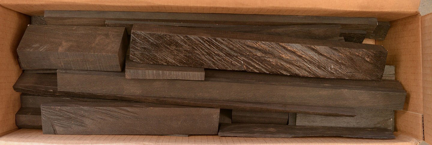Sometimes called Gabon or Gaboon, this Ebony is sometimes jet black but oftentimes has grayish streaks that mostly disappear when finished or after the made object has been put into service. This Ebony has a marked resistance to checking that is characteristic of some of the Indian and Asian species. It has a wonderful texture and is easily carved, planed, turned, and milled. It is fairly fine-grained and takes a high polish. This Ebony usually originates in either Cameroon or Nigeria and the logs are rough hewn in the forest and oftentimes brought to the nearest road by human porters. With the disappearance of other species of black Ebony this species is fast becoming the Ebony of choice.