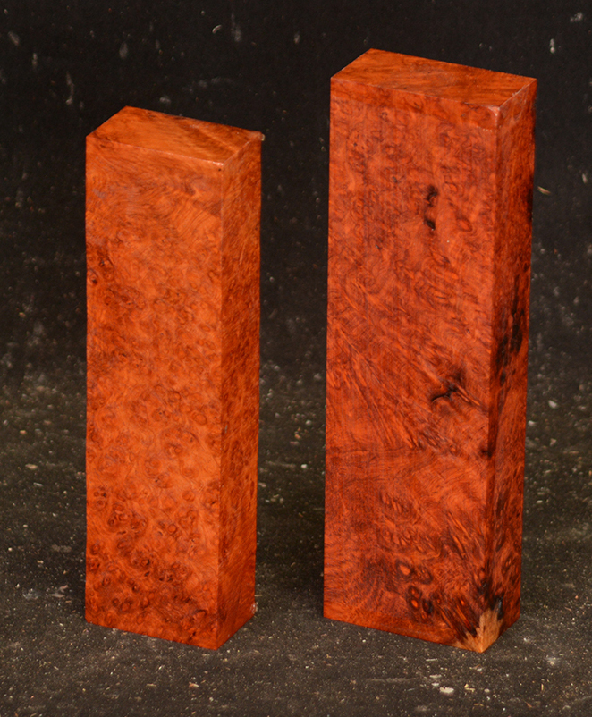 One of the world's most rare and beautiful burls. A light to deep reddish-orange, sometimes with darker lines, and with a lovely, spicy scent, there is hardly an area not highly figured with bird's-eyes. Hard & heavy and capable of taking a fine polish.