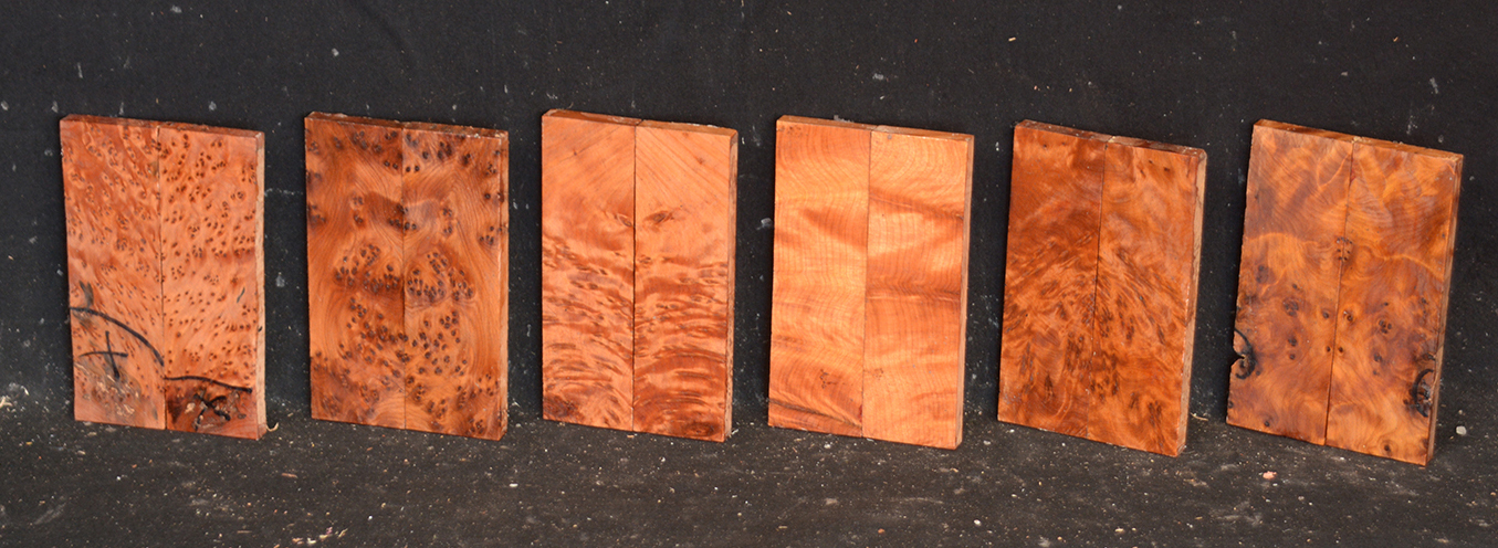 This comes from the Atlas mountains in Morocco and has a beautiful golden chatoyance. Its color varies from a rich, lustrous golden brown to nearly black. Thuya burl is hard and dense with a high oil content, but tends to be brittle. The eyes, perfectly round, are scattered about in some burls like the figure in bird's-eye maple; in others they are grouped as islands. Due to it's desert occurrence, the wood sometimes contains small defects or inclusions but most can be repaired with cyanoacrylate (super) glues. A rare species, this exquisite wood is used for inlays, small boxes, turnery, and precious objects.