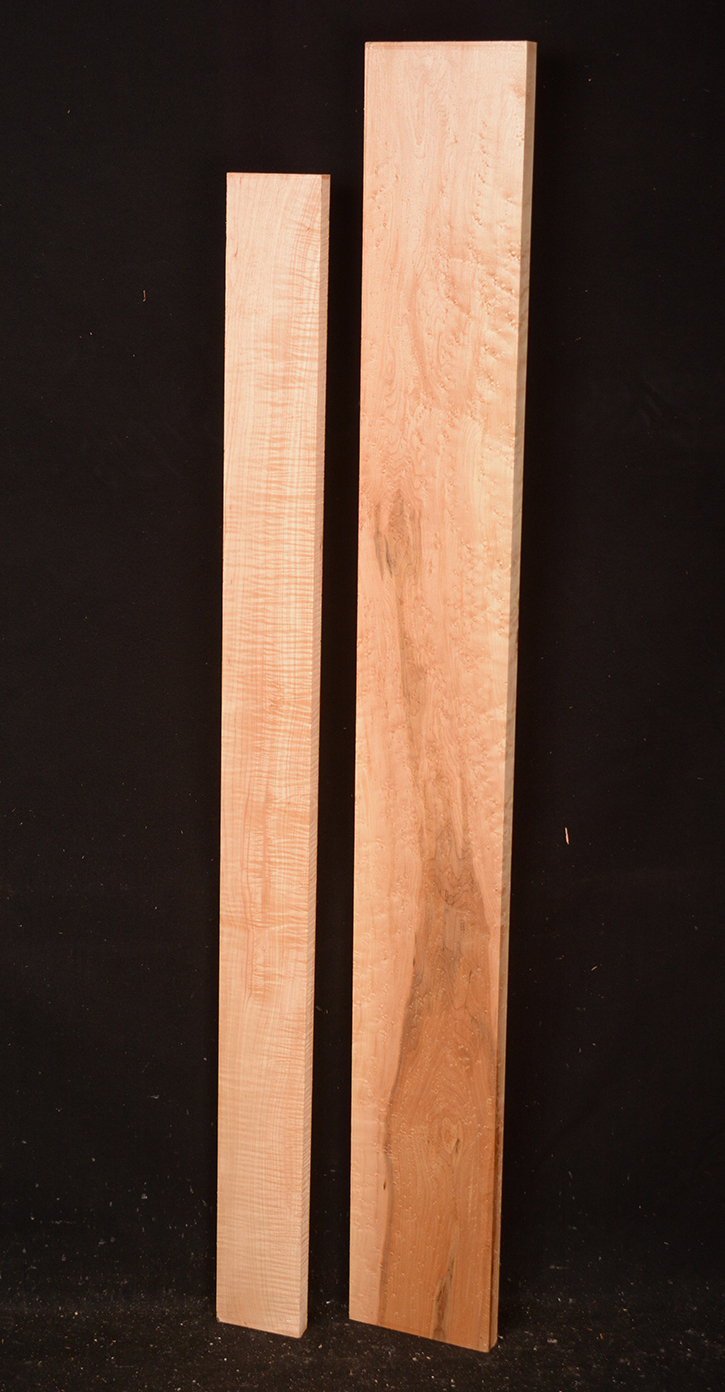 The heartwood is white or cream to light brown or reddish brown. Because of the generally small size of available logs, most sawmills produce flatsawn boards which will show a broken curl on the surface and a fiddleback curl on the quartersawn edge. Hard and heavy, 45 lbs/cu ft. Easy to work and takes a smooth polish. U.S.A.