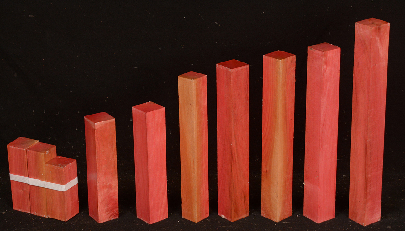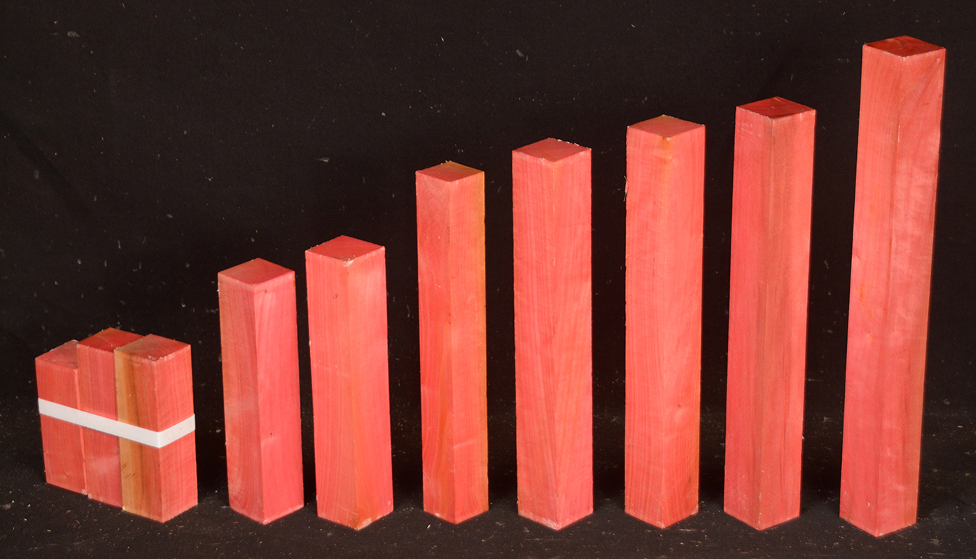 A fairly rare wood from Southern Africa ranging in color from light pink to watermelon red. At one time it was described as being "rarer than diamonds". It is very dense, hard and heavy and takes a very high polish. Beautiful for turnery, inlays and other precious items.