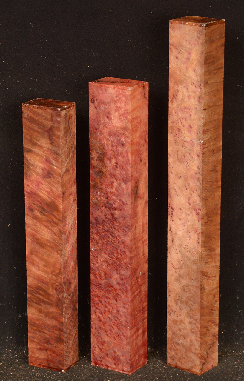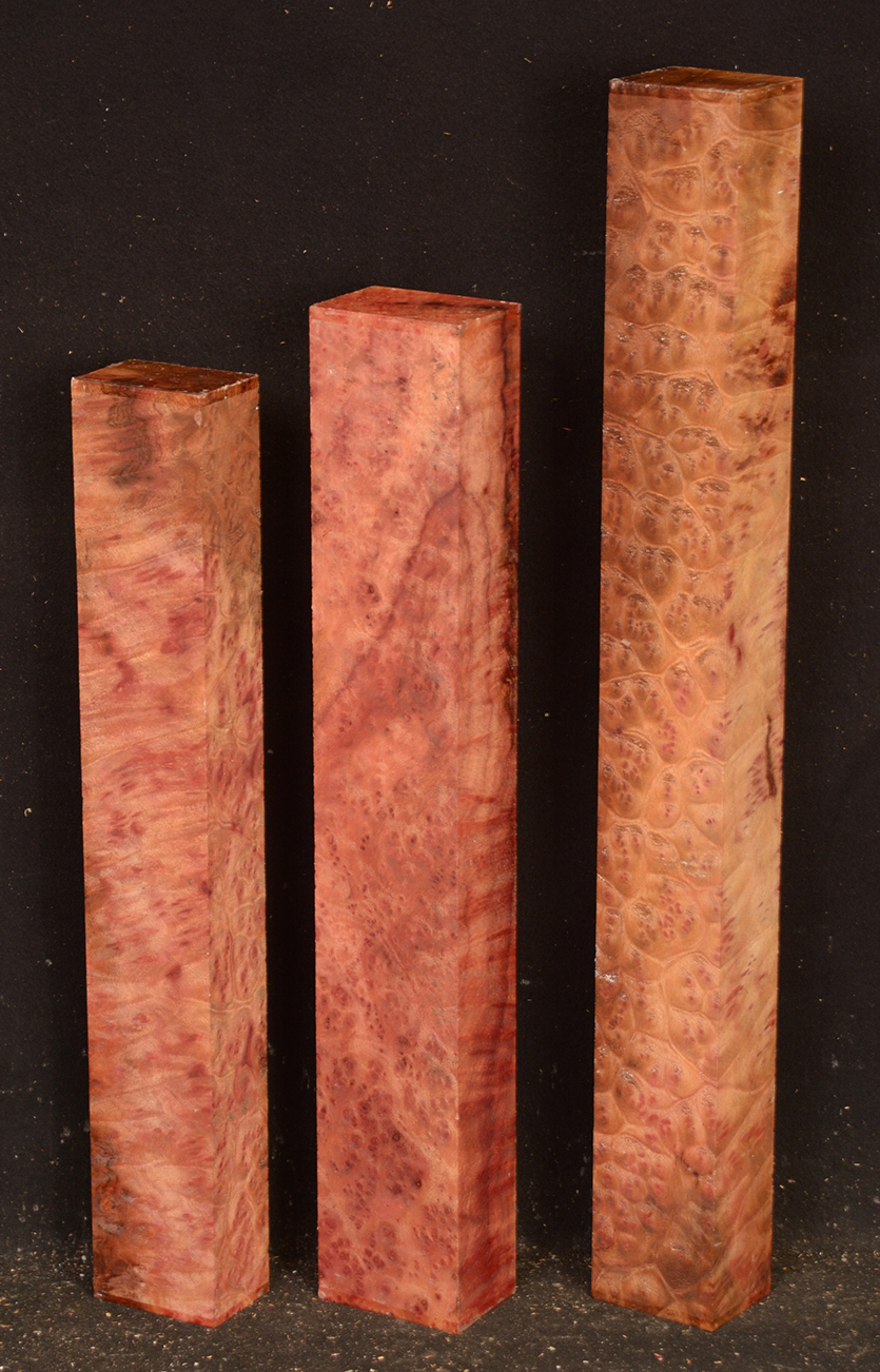 This rare burl is from S.E. Asia and is seldom seen on the world market. It is fine-grained and varies in color from a light reddish-brown to almost scarlet. It is easy to work and has a very pungent, spicy scent. For a burl it is remarkably stable. Green to partially air dried.