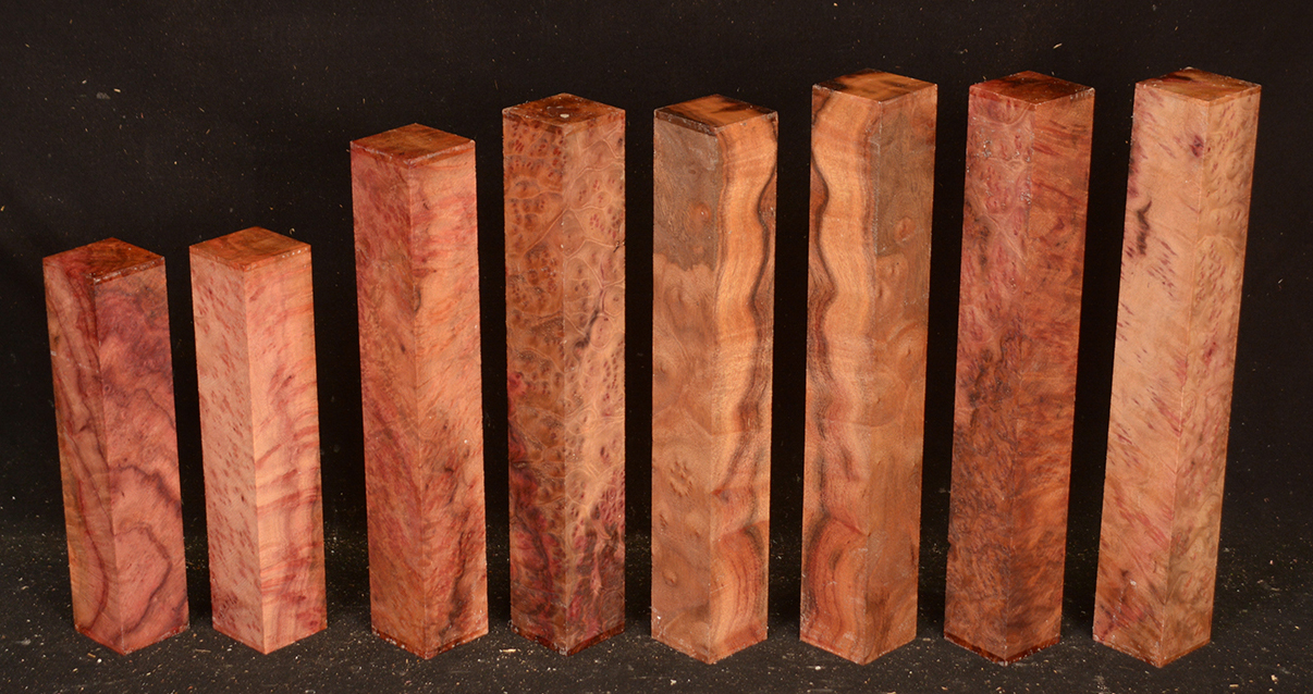 This rare burl is from S.E. Asia and is seldom seen on the world market. It is fine-grained and varies in color from a light reddish-brown to almost scarlet. It is easy to work and has a very pungent, spicy scent. For a burl it is remarkably stable. Green to partially air dried.