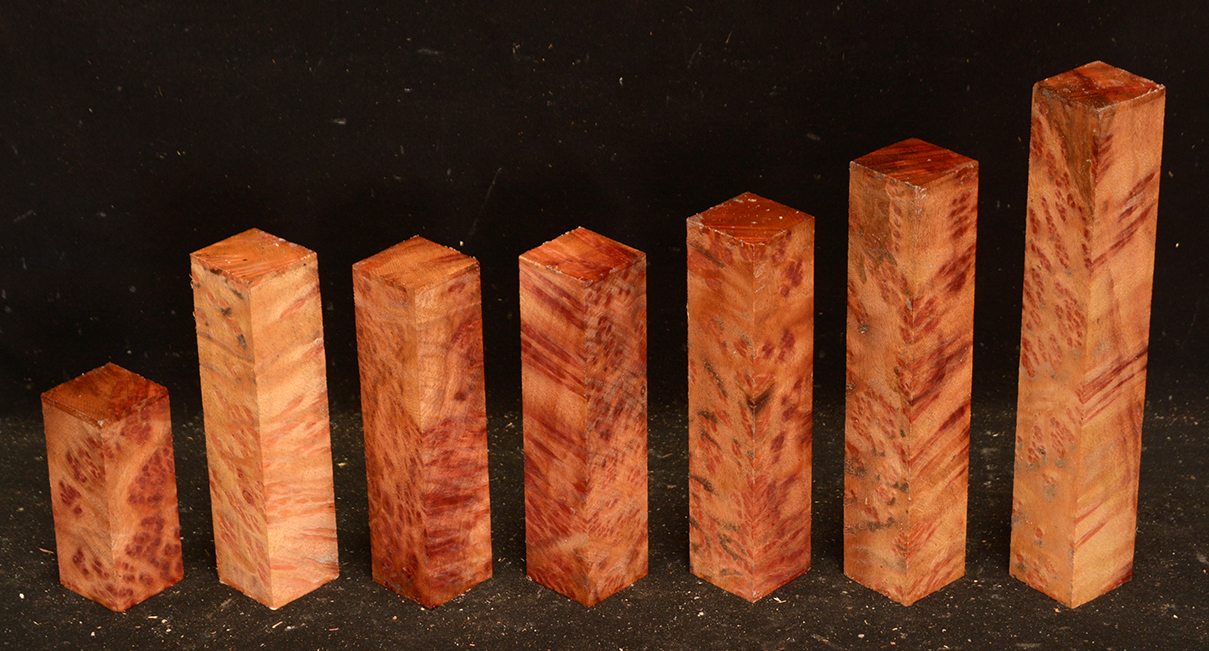 This rare burl is from S.E. Asia and is seldom seen on the world market. It is fine-grained and varies in color from a light reddish-brown to almost scarlet. It is easy to work and has a very pungent, spicy scent. For a burl it is remarkably stable. Green to partially air dried.