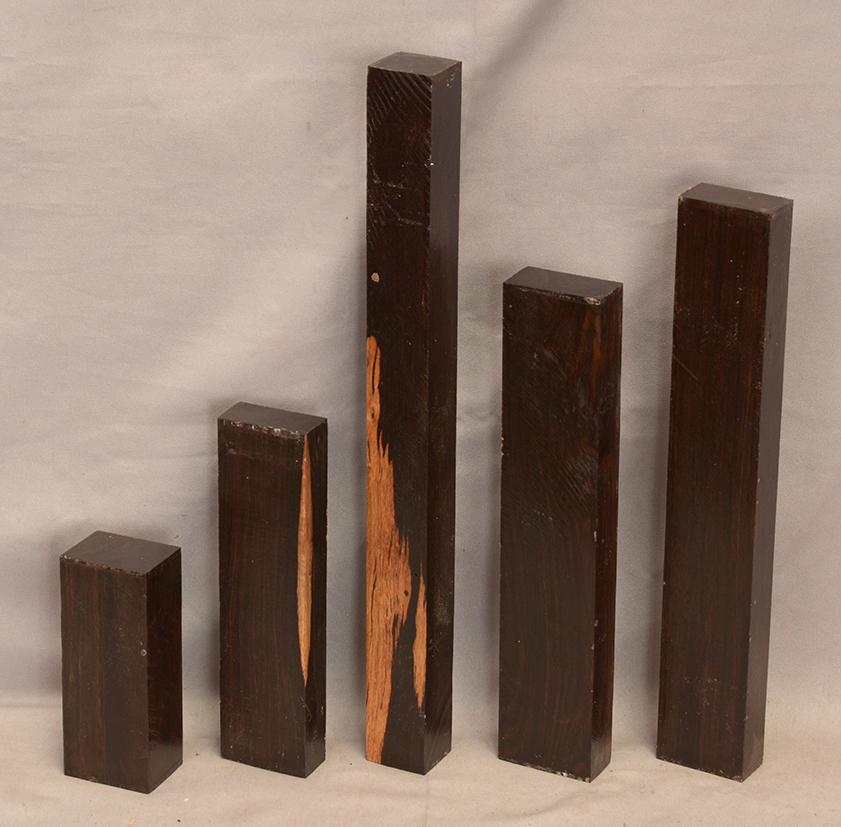 Sometimes called Gabon or Gaboon, this Ebony is sometimes jet black but oftentimes has grayish streaks that mostly disappear when finished or after the made object has been put into service. This Ebony has a marked resistance to checking that is characteristic of some of the Indian and Asian species. It has a wonderful texture and is easily carved, planed, turned, and milled. It is fairly fine-grained and takes a high polish. This Ebony usually originates in either Cameroon or Nigeria and the logs are rough hewn in the forest and oftentimes brought to the nearest road by human porters. With the disappearance of other species of black Ebony this species is fast becoming the Ebony of choice.