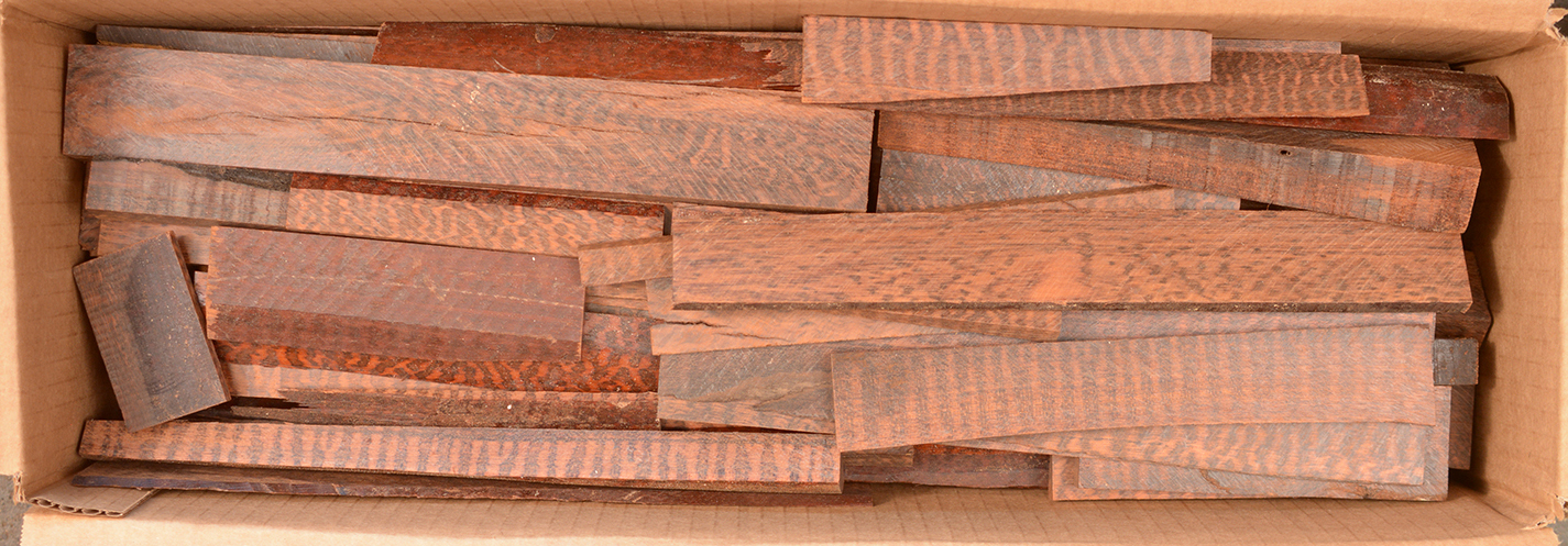 Also called Letterwood and Leopardwood. Color: dark red to reddish brown with irregular black speckles or stripes. Fine textured and highly lustrous. Very hard and heavy, 75-84 lbs/cu ft. Takes a beautiful finish. Very rare and very expensive. Guyana and Surinam.
