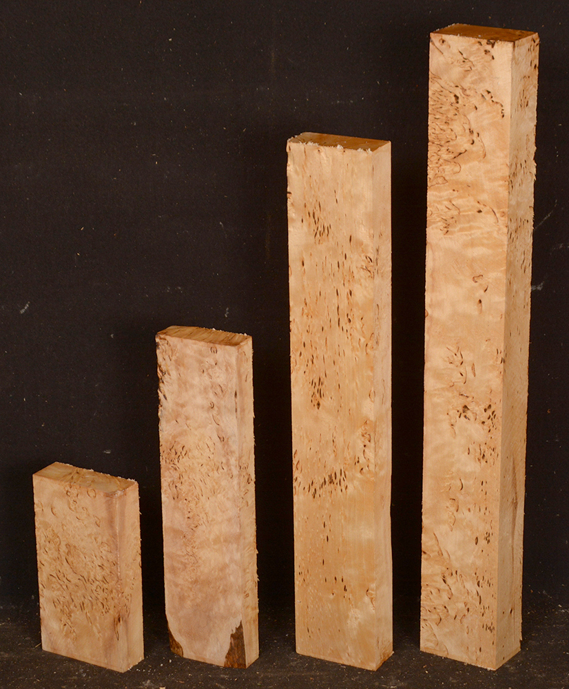 Also called Alpine Burl or Karelian Burl after the Finnish province of Karelia where it is often found. The high figure found in this wood is caused when the tree heals the damage done by an invasive boring beetle. The beetle infestation leaves the trees stunted and sometimes deformed but produces wood with small twists and swirls that highlight the darker, burly figure. Rare.