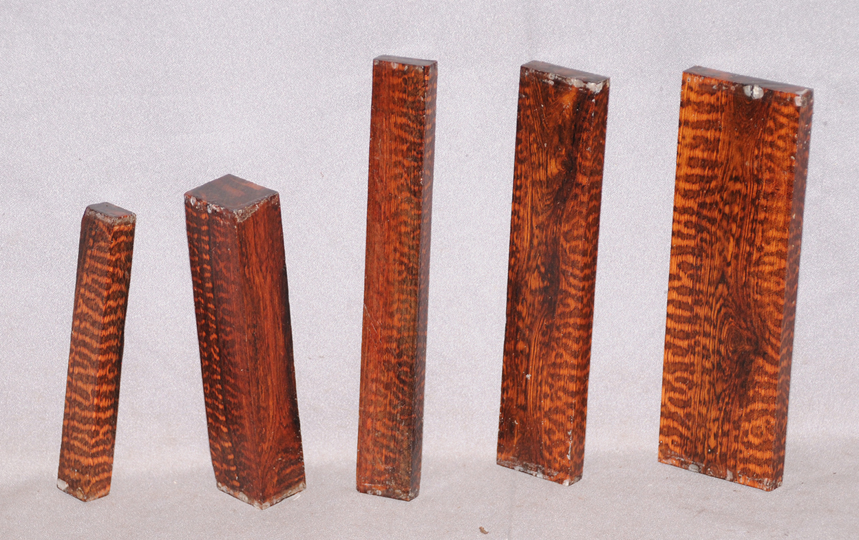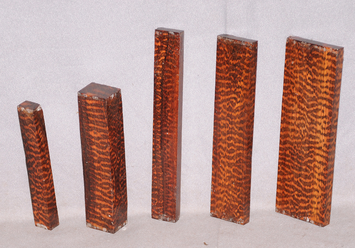 Also called Letterwood and Leopardwood. Color: dark red to reddish brown with irregular black speckles or stripes. Fine textured and highly lustrous. Very hard and heavy, 75-84 lbs/cu ft. Takes a beautiful finish. Very rare and very expensive. Guyana and Surinam.