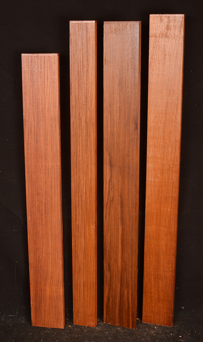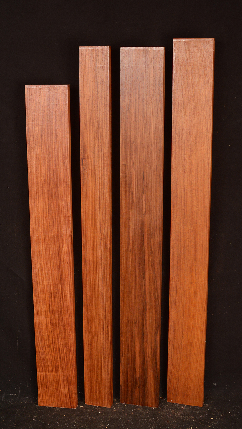 This rare Brazilian Tulipwood look-a-like is a true Dalbergia species and like many others in the genus it has flashy color, an aromatic smell, is fairly hard and heavy, and is very stable in use. These pieces were originally cut as guitar fingerboards, for which they are excellent, but they can also be used for box sides, drawer fronts, etc.