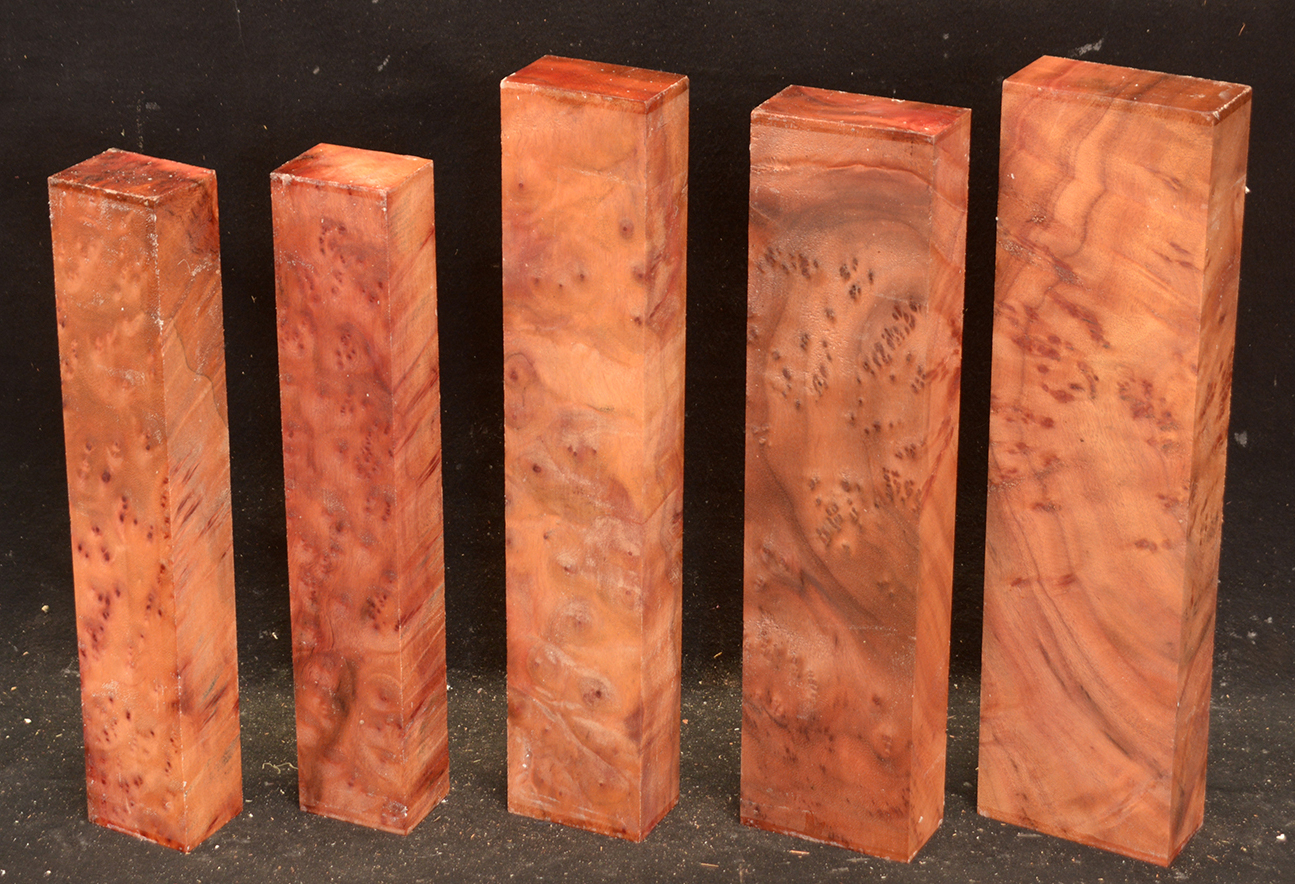 This rare burl is from S.E. Asia and is seldom seen on the world market. It is fine-grained and varies in color from a light reddish-brown to almost scarlet. It is easy to work and has a very pungent, spicy scent. For a burl it is remarkably stable. Green to partially air dried.