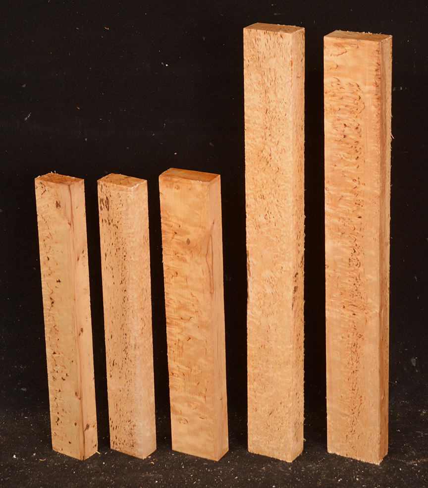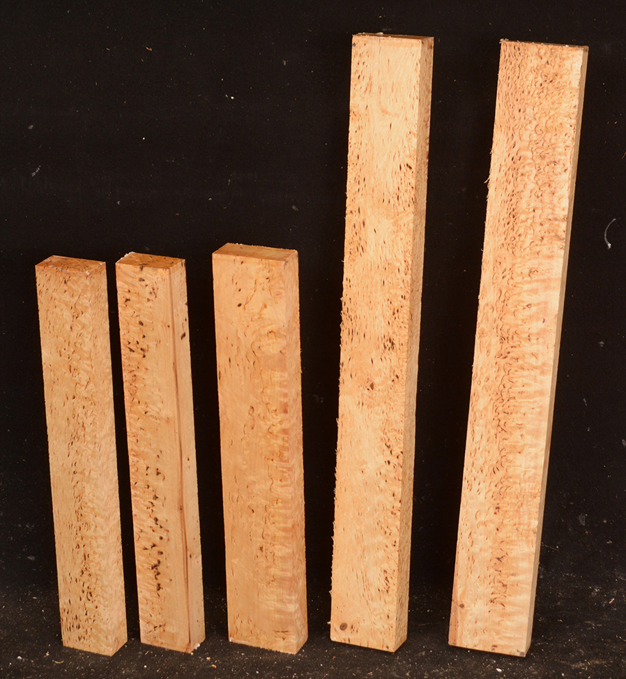 Also called Alpine Burl or Karelian Burl after the Finnish province of Karelia where it is often found. The high figure found in this wood is caused when the tree heals the damage done by an invasive boring beetle. The beetle infestation leaves the trees stunted and sometimes deformed but produces wood with small twists and swirls that highlight the darker, burly figure. Rare.
