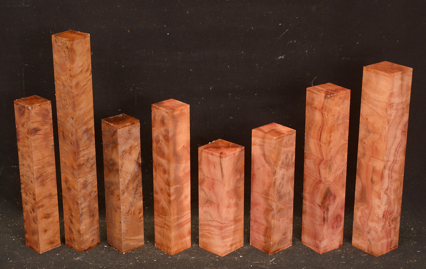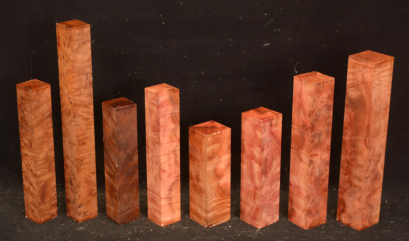 This rare burl is from S.E. Asia and is seldom seen on the world market. It is fine-grained and varies in color from a light reddish-brown to almost scarlet. It is easy to work and has a very pungent, spicy scent. For a burl it is remarkably stable. Green to partially air dried.