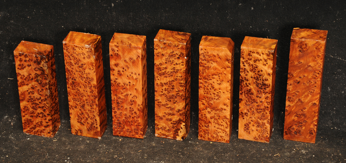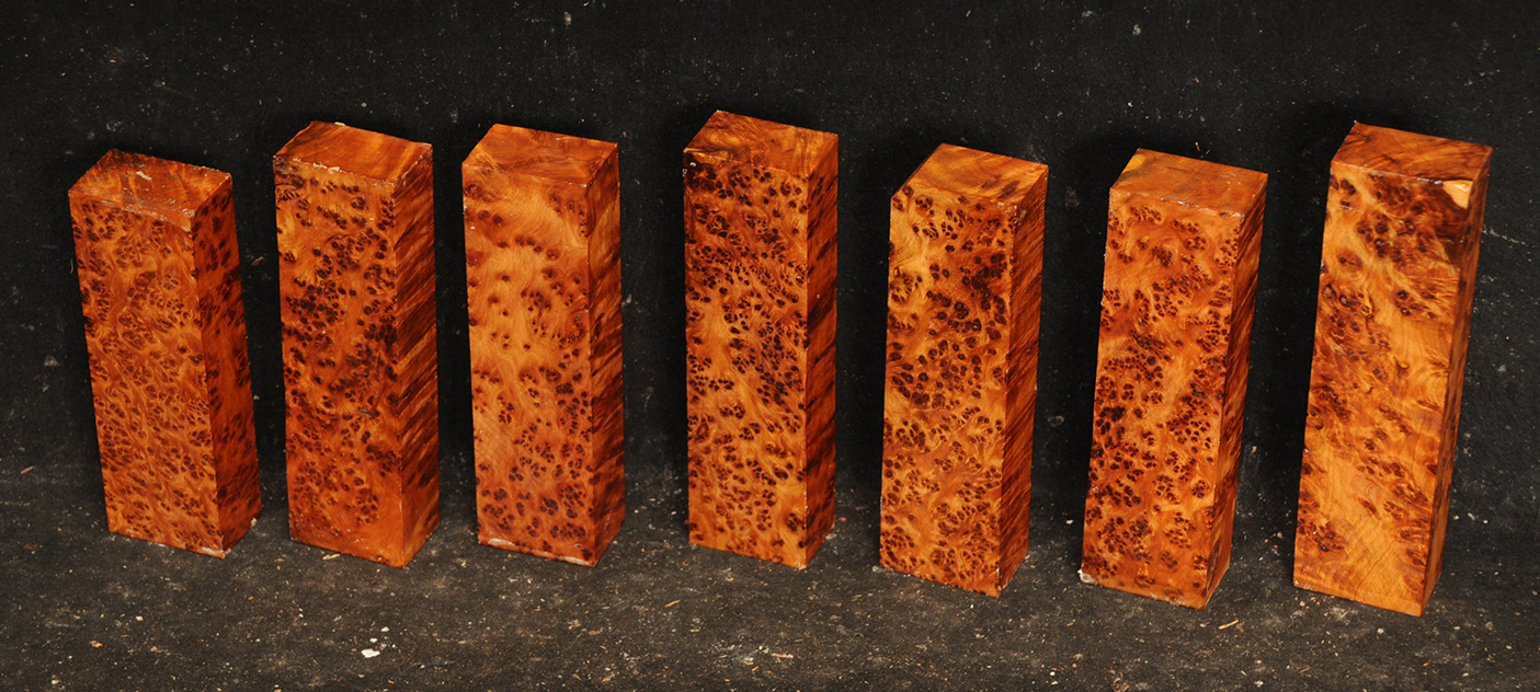 This comes from the Atlas mountains in Morocco and has a beautiful golden chatoyance. Its color varies from a rich, lustrous golden brown to nearly black. Thuya burl is hard and dense with a high oil content, but tends to be brittle. The eyes, perfectly round, are scattered about in some burls like the figure in bird's-eye maple; in others they are grouped as islands. Due to it's desert occurrence, the wood sometimes contains small defects or inclusions but most can be repaired with cyanoacrylate (super) glues. A rare species, this exquisite wood is used for inlays, small boxes, turnery, and precious objects.