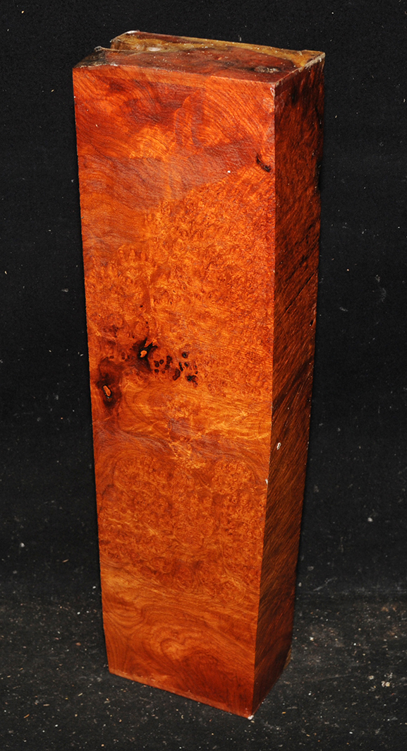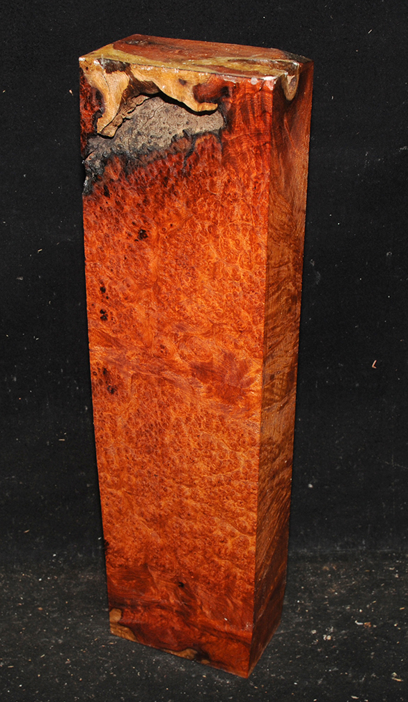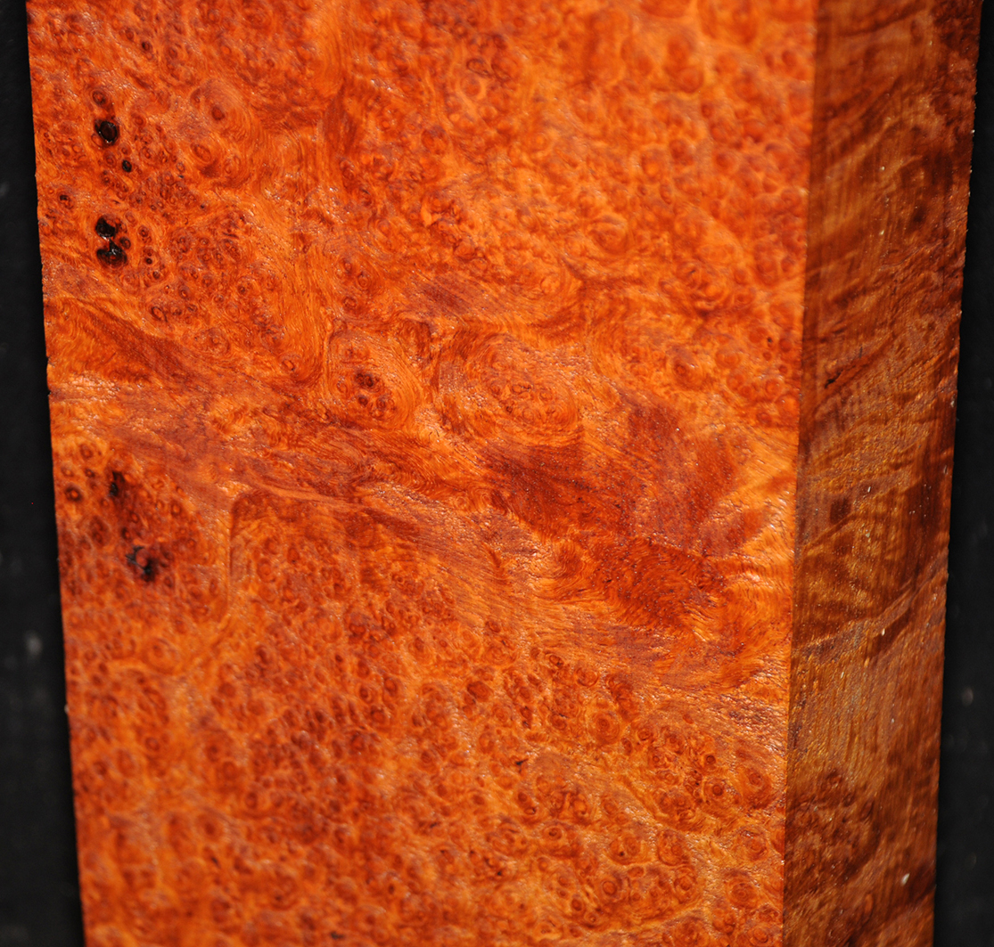 One of the world's most rare and beautiful burls. A light to deep reddish-orange, sometimes with darker lines, and with a lovely, spicy scent, there is hardly an area not highly figured with bird's-eyes. Hard & heavy and capable of taking a fine polish.