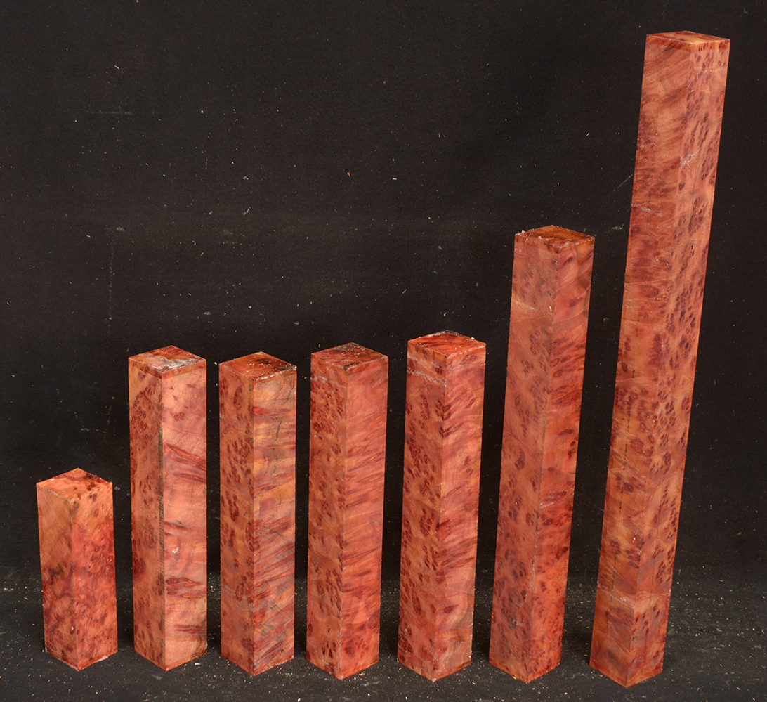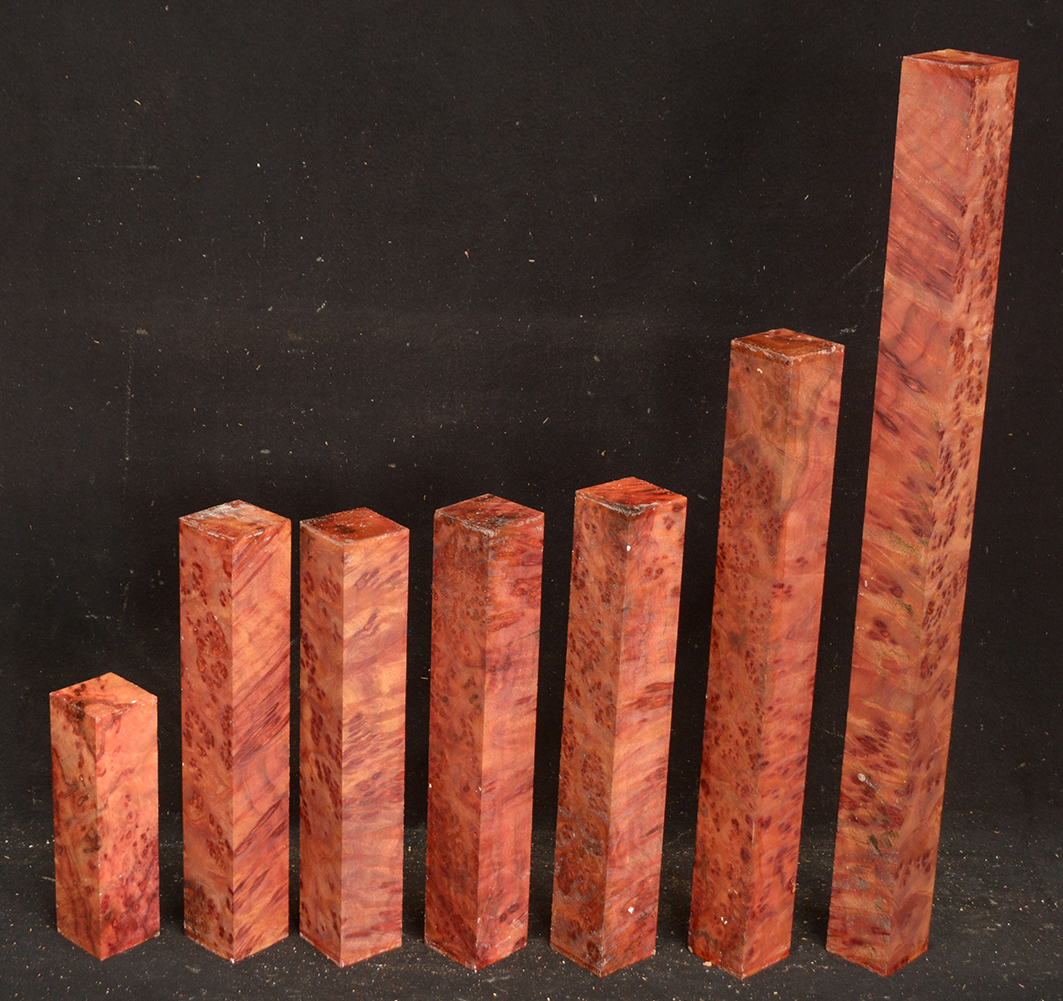 This rare burl is from S.E. Asia and is seldom seen on the world market. It is fine-grained and varies in color from a light reddish-brown to almost scarlet. It is easy to work and has a very pungent, spicy scent. For a burl it is remarkably stable. Green to partially air dried.