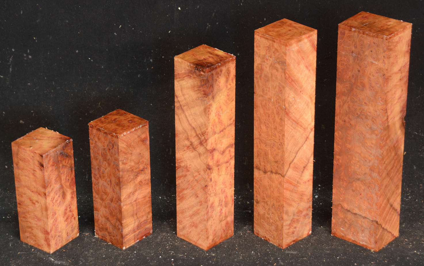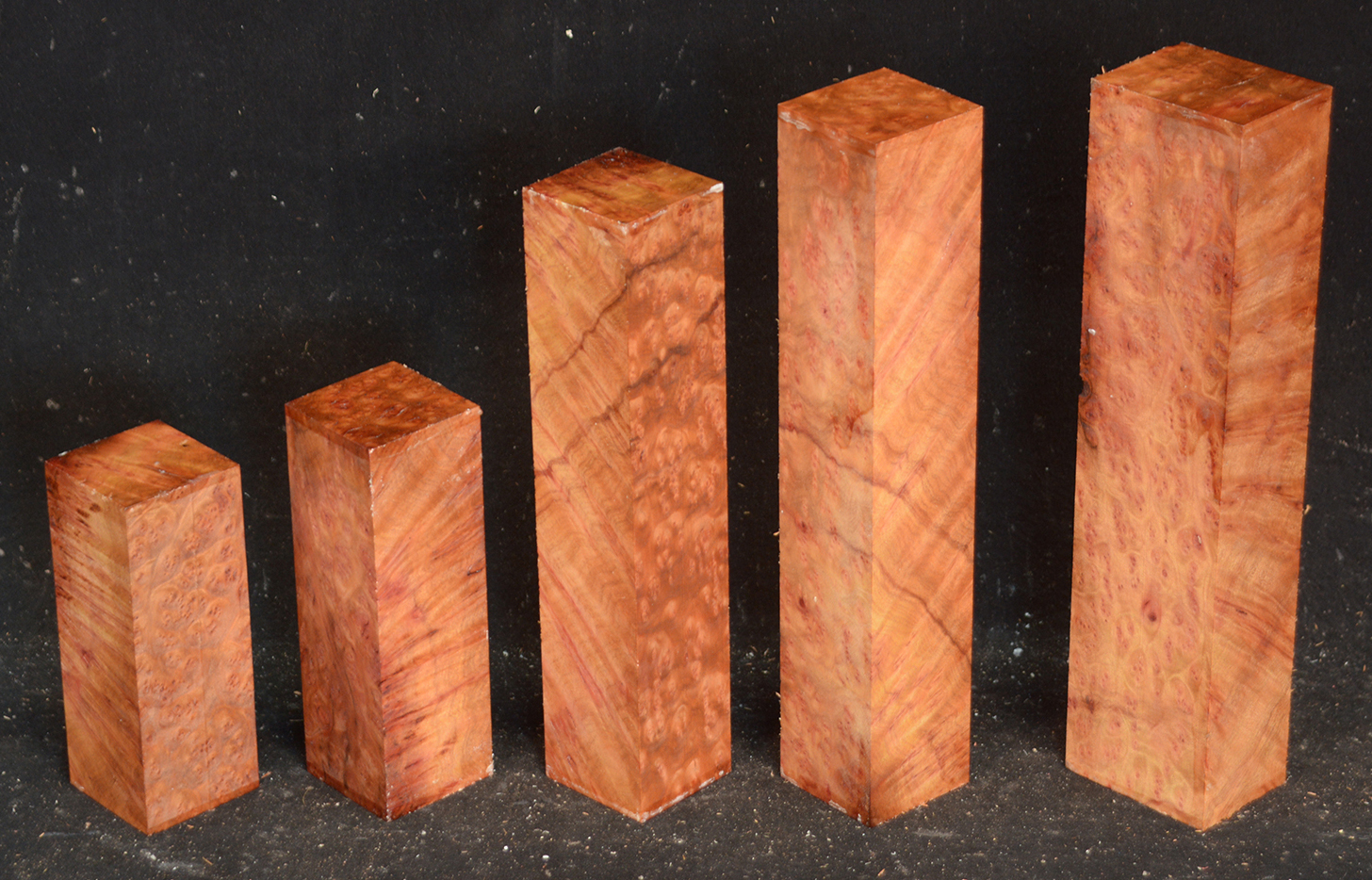 One of the world's most rare and beautiful burls. A light to deep reddish-orange, sometimes with darker lines, and with a lovely, spicy scent, there is hardly an area not highly figured with bird's-eyes. Hard & heavy and capable of taking a fine polish.