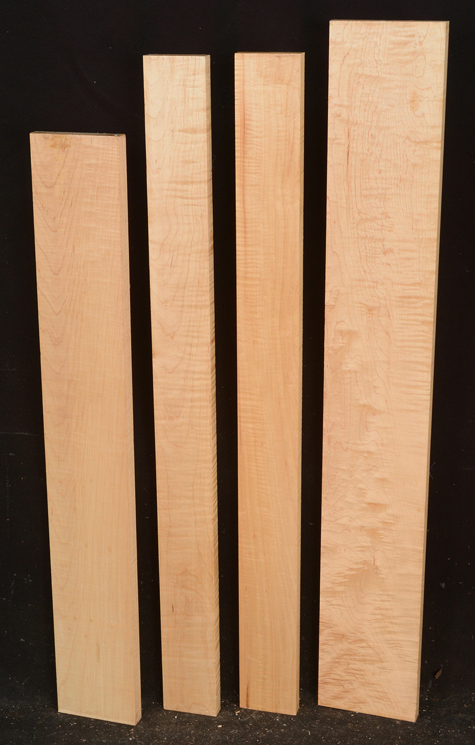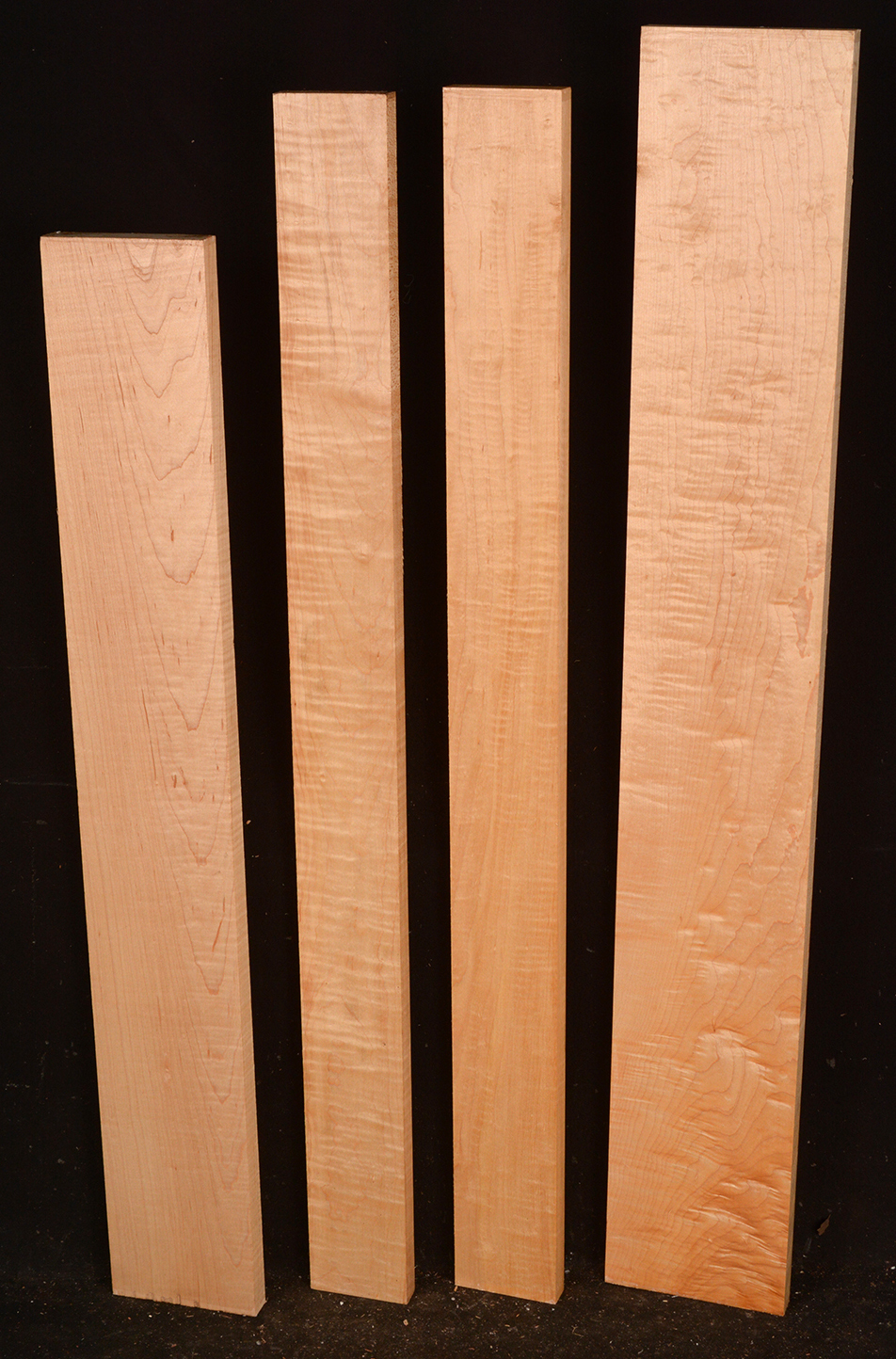 The heartwood is white or cream to light brown or reddish brown. Because of the generally small size of available logs, most sawmills produce flatsawn boards which will show a broken curl on the surface and a fiddleback curl on the quartersawn edge. Hard and heavy, 45 lbs/cu ft. Easy to work and takes a smooth polish. U.S.A.