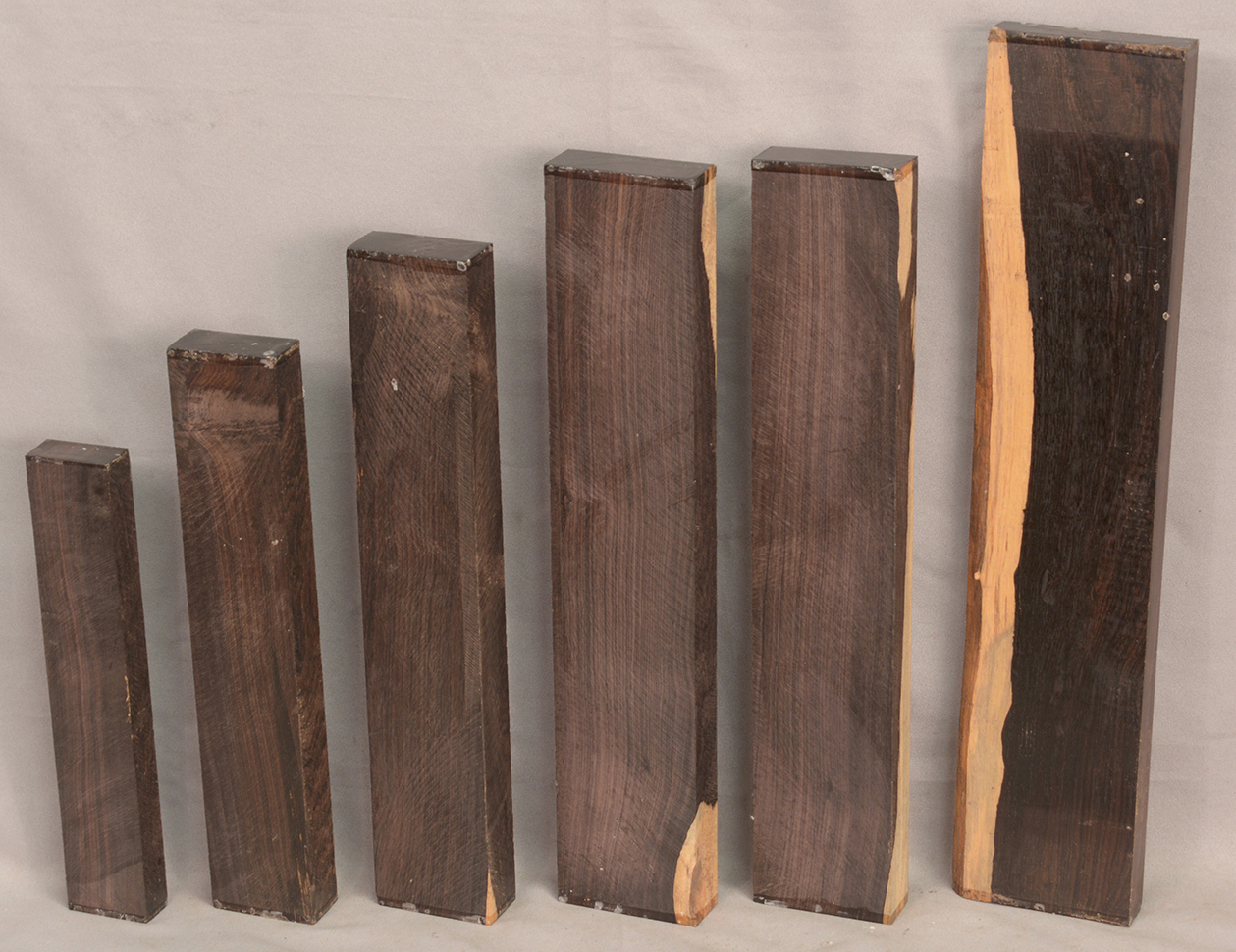 The heartwood is purplish to brownish-black with dark gray streaks giving an overall impression of being black. Lustrous with an attractive inner chatoyance. Very hard, heavy, close-grained, and virtually free from pores. Its stability and lovely tonal qualities make it an excellent instrument wood.
