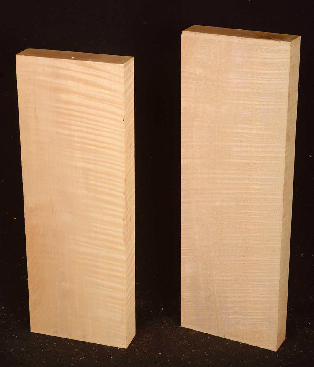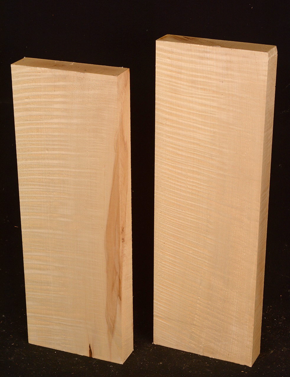 This European Maple is native to central Europe and west Asia. It is a tough, white or cream colored, fine-grained timber. It reminds me of vanilla ice cream because it is so even-colored. It works well in any grain direction. It is used for musical instruments, furniture, cabinetry, and because it is non-staining it is used for kitchen utensils, wooden spoons, rolling pins, and cutting boards. The figure is fiddleback on the quartersawn surface and more of a broken curl on the flatsawn surface. Select, quartersawn material is used for violin backs and sides and necks. Dry.