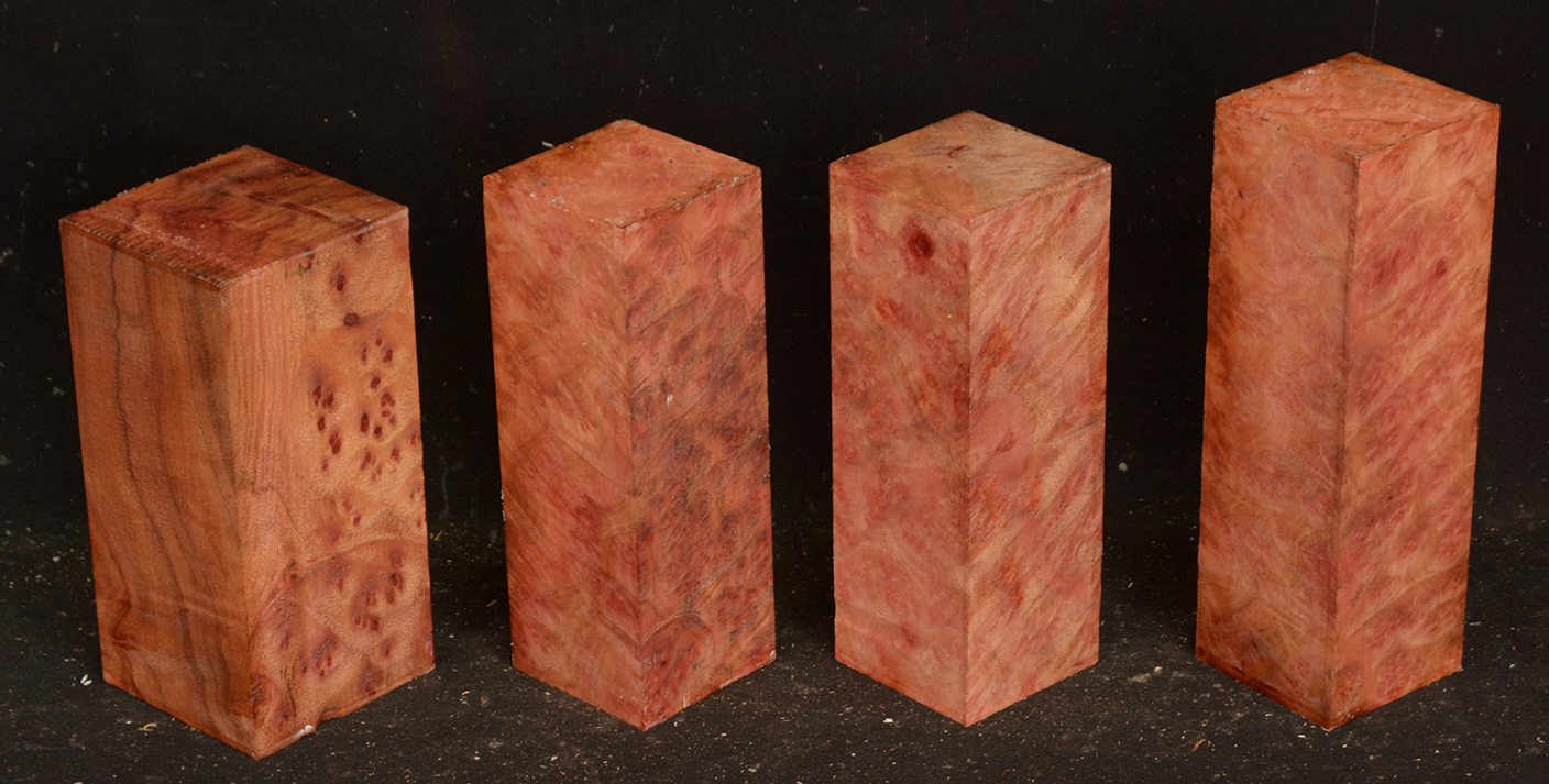 This rare burl is from S.E. Asia and is seldom seen on the world market. It is fine-grained and varies in color from a light reddish-brown to almost scarlet. It is easy to work and has a very pungent, spicy scent. For a burl it is remarkably stable. Green to partially air dried.