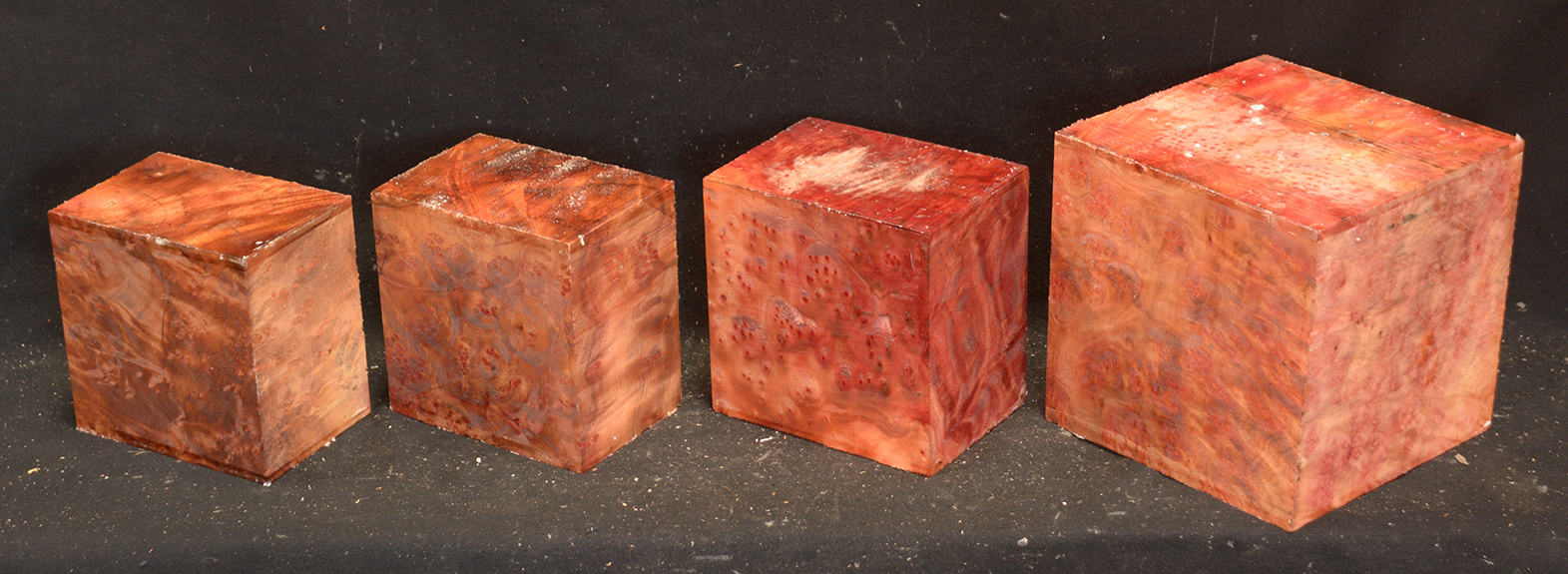 This rare burl is from S.E. Asia and is seldom seen on the world market. It is fine-grained and varies in color from a light reddish-brown to almost scarlet. It is easy to work and has a very pungent, spicy scent. For a burl it is remarkably stable. Green to partially air dried.