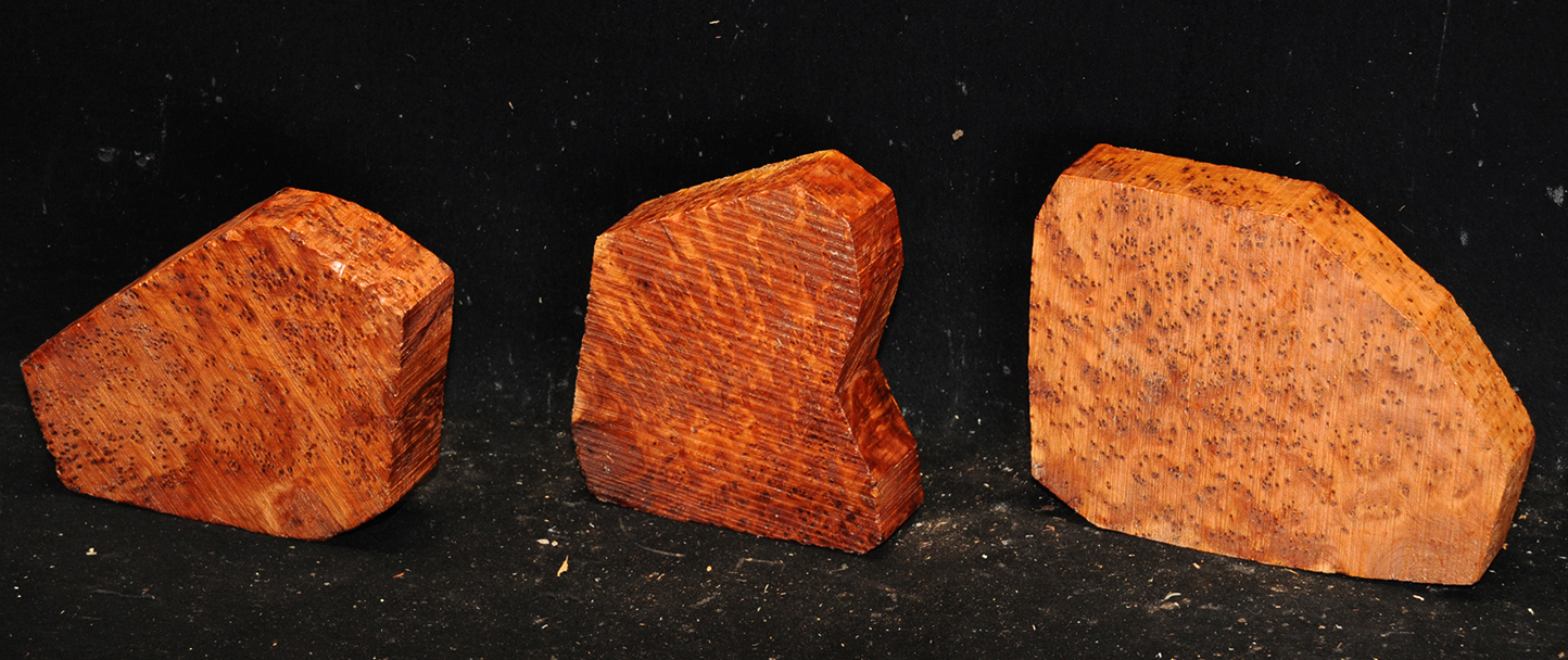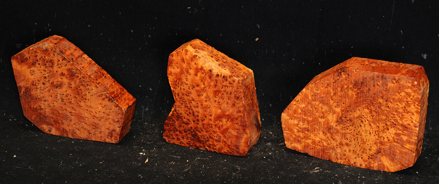 This comes from the Atlas mountains in Morocco and has a beautiful golden chatoyance. Its color varies from a rich, lustrous golden brown to nearly black. Thuya burl is hard and dense with a high oil content, but tends to be brittle. The eyes, perfectly round, are scattered about in some burls like the figure in bird's-eye maple; in others they are grouped as islands. Due to it's desert occurrence, the wood sometimes contains small defects or inclusions but most can be repaired with cyanoacrylate (super) glues. A rare species, this exquisite wood is used for inlays, small boxes, turnery, and precious objects.
