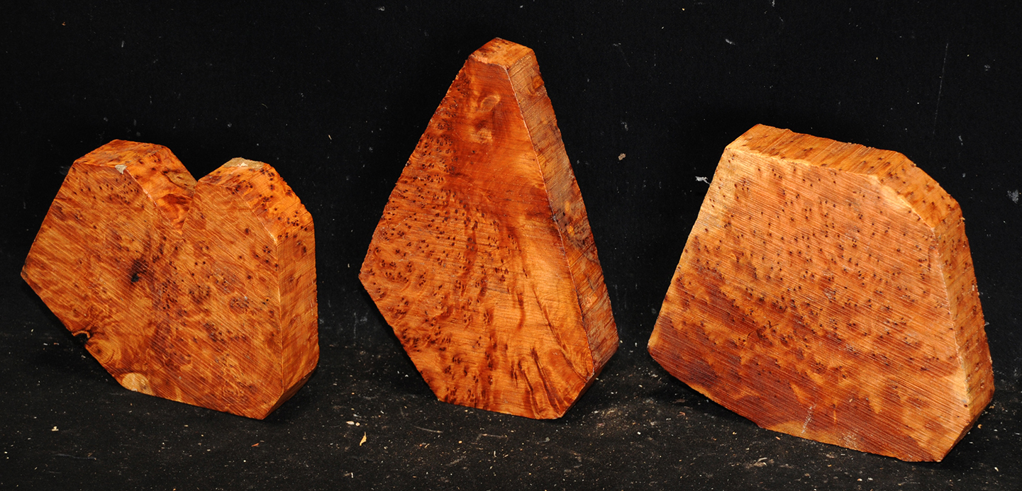 This comes from the Atlas mountains in Morocco and has a beautiful golden chatoyance. Its color varies from a rich, lustrous golden brown to nearly black. Thuya burl is hard and dense with a high oil content, but tends to be brittle. The eyes, perfectly round, are scattered about in some burls like the figure in bird's-eye maple; in others they are grouped as islands. Due to it's desert occurrence, the wood sometimes contains small defects or inclusions but most can be repaired with cyanoacrylate (super) glues. A rare species, this exquisite wood is used for inlays, small boxes, turnery, and precious objects.