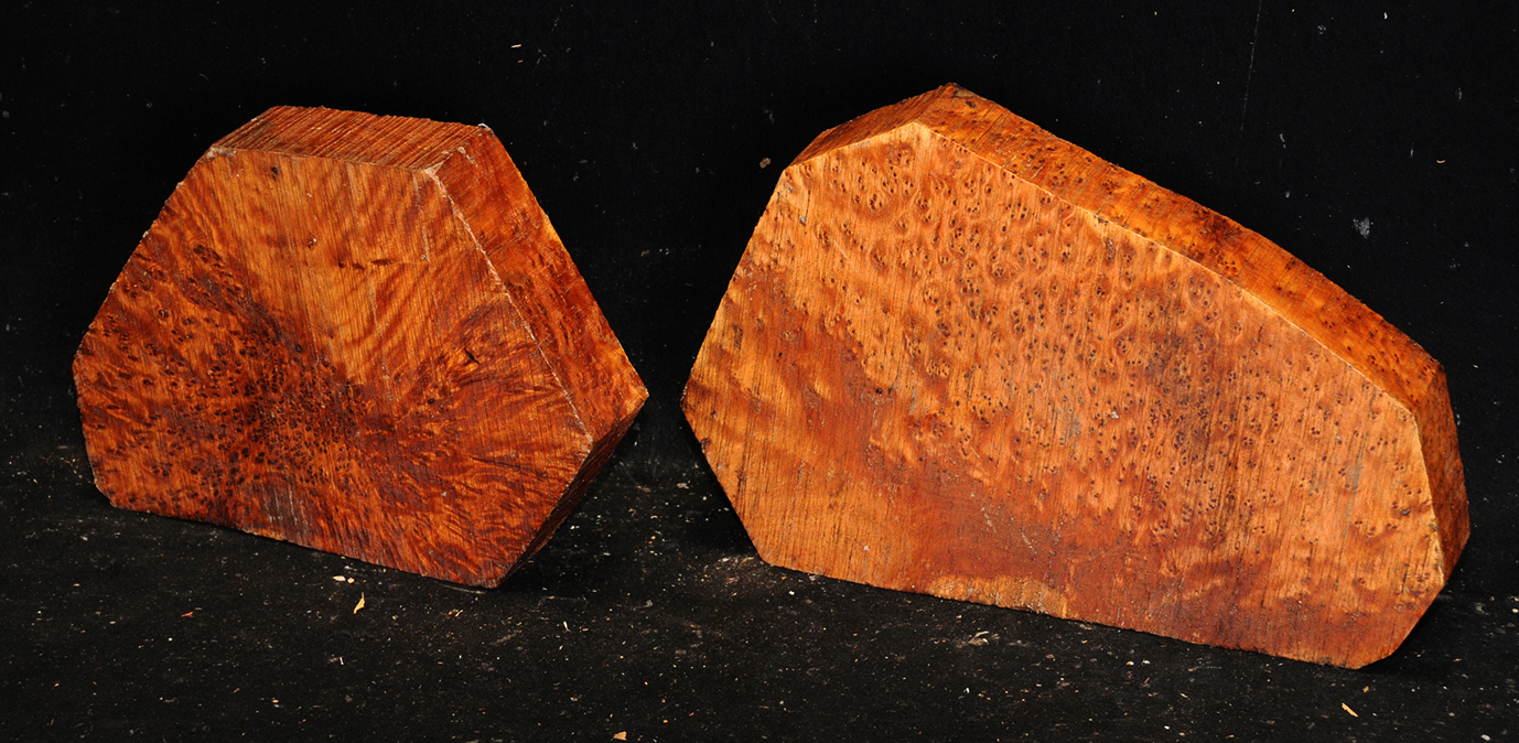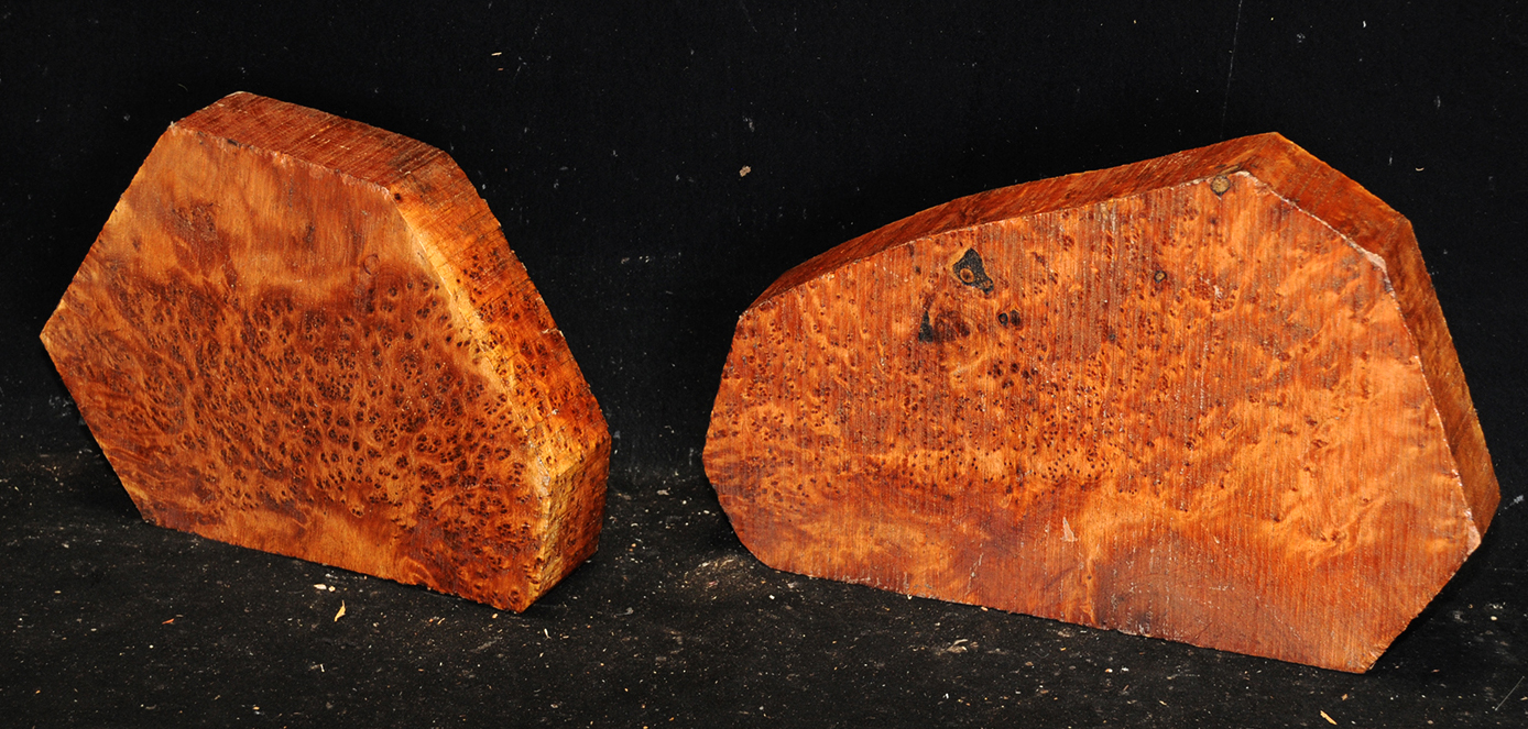 This comes from the Atlas mountains in Morocco and has a beautiful golden chatoyance. Its color varies from a rich, lustrous golden brown to nearly black. Thuya burl is hard and dense with a high oil content, but tends to be brittle. The eyes, perfectly round, are scattered about in some burls like the figure in bird's-eye maple; in others they are grouped as islands. Due to it's desert occurrence, the wood sometimes contains small defects or inclusions but most can be repaired with cyanoacrylate (super) glues. A rare species, this exquisite wood is used for inlays, small boxes, turnery, and precious objects.