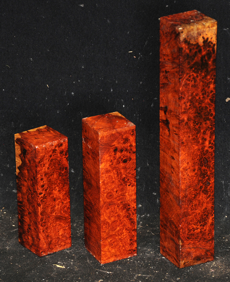 One of the world's most rare and beautiful burls. A light to deep reddish-orange, sometimes with darker lines, and with a lovely, spicy scent, there is hardly an area not highly figured with bird's-eyes. Hard & heavy and capable of taking a fine polish.