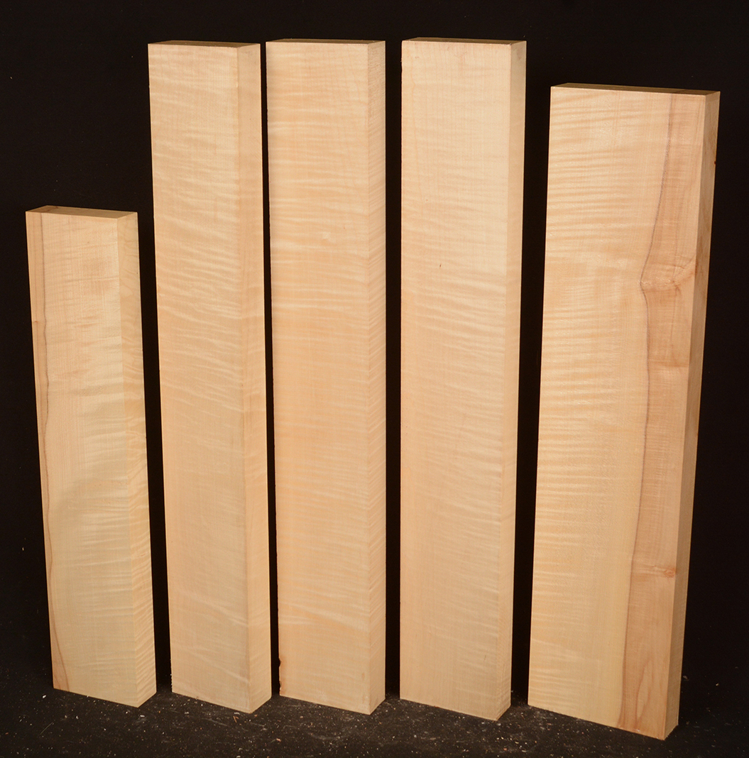 This European Maple is native to central Europe and west Asia. It is a tough, white or cream colored, fine-grained timber. It reminds me of vanilla ice cream because it is so even-colored. It works well in any grain direction. It is used for musical instruments, furniture, cabinetry, and because it is non-staining it is used for kitchen utensils, wooden spoons, rolling pins, and cutting boards. The figure is fiddleback on the quartersawn surface and more of a broken curl on the flatsawn surface. Select, quartersawn material is used for violin backs and sides and necks. Dry.