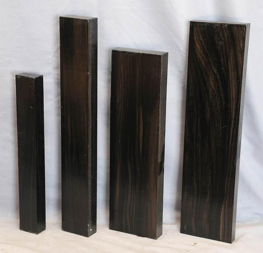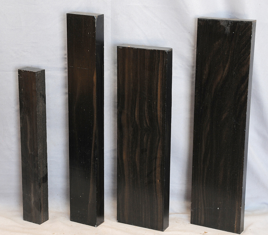 Sometimes called Gabon or Gaboon, this Ebony is sometimes jet black but oftentimes has grayish streaks that mostly disappear when finished or after the made object has been put into service. This Ebony has a marked resistance to checking that is characteristic of some of the Indian and Asian species. It has a wonderful texture and is easily carved, planed, turned, and milled. It is fairly fine-grained and takes a high polish. This Ebony usually originates in either Cameroon or Nigeria and the logs are rough hewn in the forest and oftentimes brought to the nearest road by human porters. With the disappearance of other species of black Ebony this species is fast becoming the Ebony of choice.