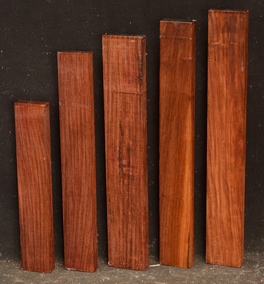 This Rosewood species has a reddish-brown to dark brown colored heartwood contrasting the almost white sapwood. The dust has a sweet odor. It is an excellent furniture/case works/jewelry box wood and even though it has a medium texture it does take a nice polish. We also offer it as a musical instrument wood (see guitar fingerboards and backs & sides elsewhere on the site). It has a very "crisp" tap tone with good sustain.