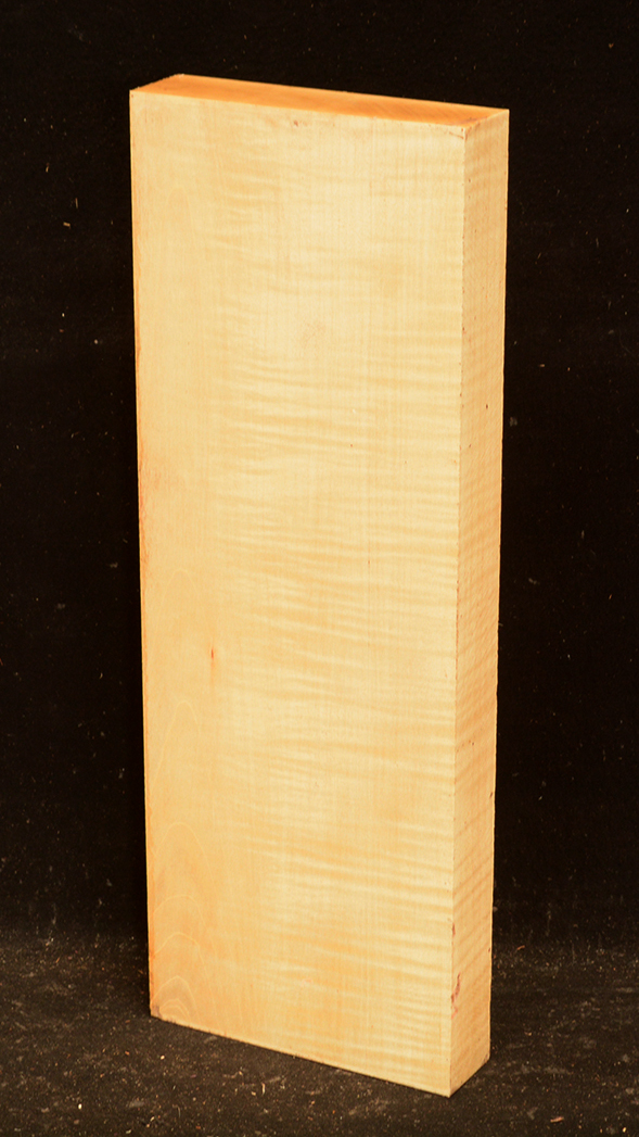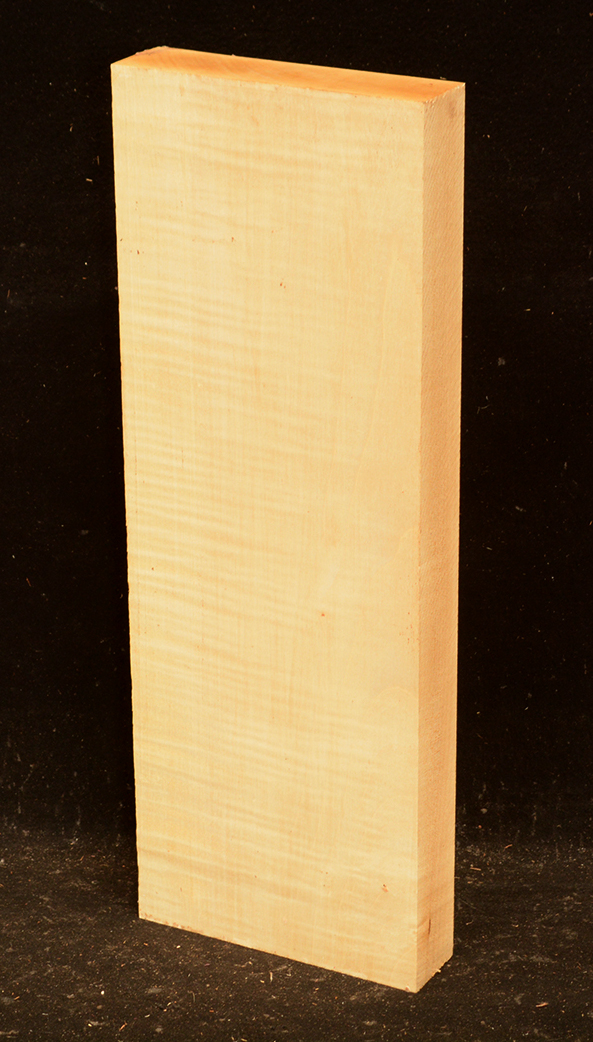 This European Maple is native to central Europe and west Asia. It is a tough, white or cream colored, fine-grained timber. It reminds me of vanilla ice cream because it is so even-colored. It works well in any grain direction. It is used for musical instruments, furniture, cabinetry, and because it is non-staining it is used for kitchen utensils, wooden spoons, rolling pins, and cutting boards. The figure is fiddleback on the quartersawn surface and more of a broken curl on the flatsawn surface. Select, quartersawn material is used for violin backs and sides and necks. Dry.