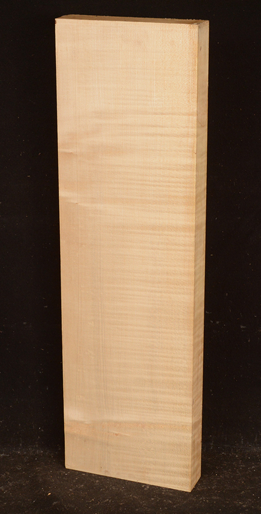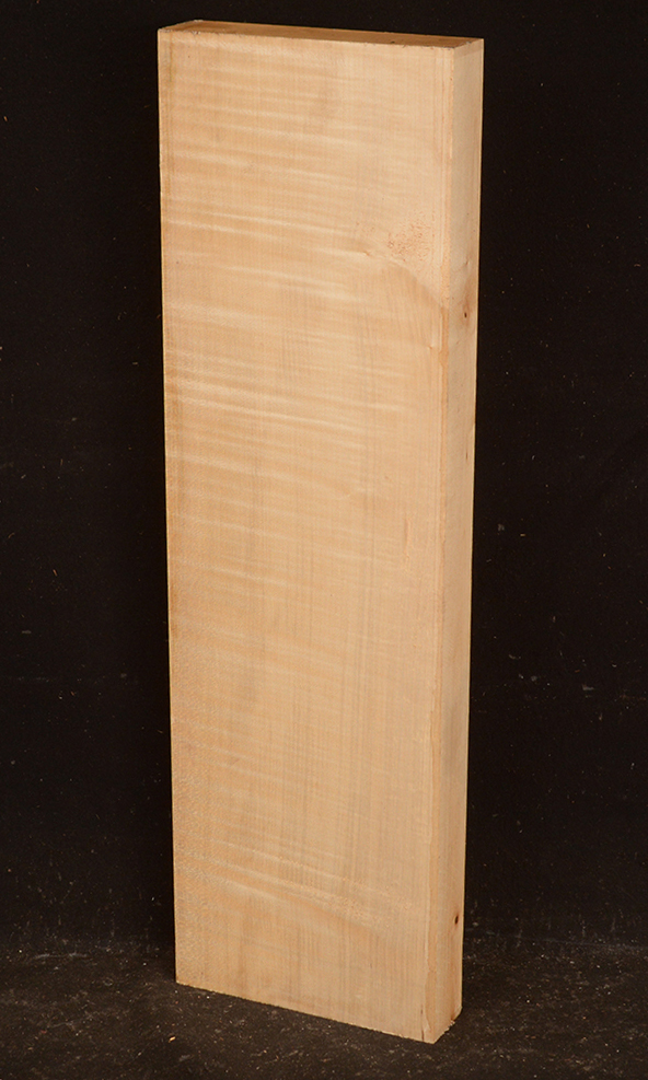 This European Maple is native to central Europe and west Asia. It is a tough, white or cream colored, fine-grained timber. It reminds me of vanilla ice cream because it is so even-colored. It works well in any grain direction. It is used for musical instruments, furniture, cabinetry, and because it is non-staining it is used for kitchen utensils, wooden spoons, rolling pins, and cutting boards. The figure is fiddleback on the quartersawn surface and more of a broken curl on the flatsawn surface. Select, quartersawn material is used for violin backs and sides and necks. Dry.