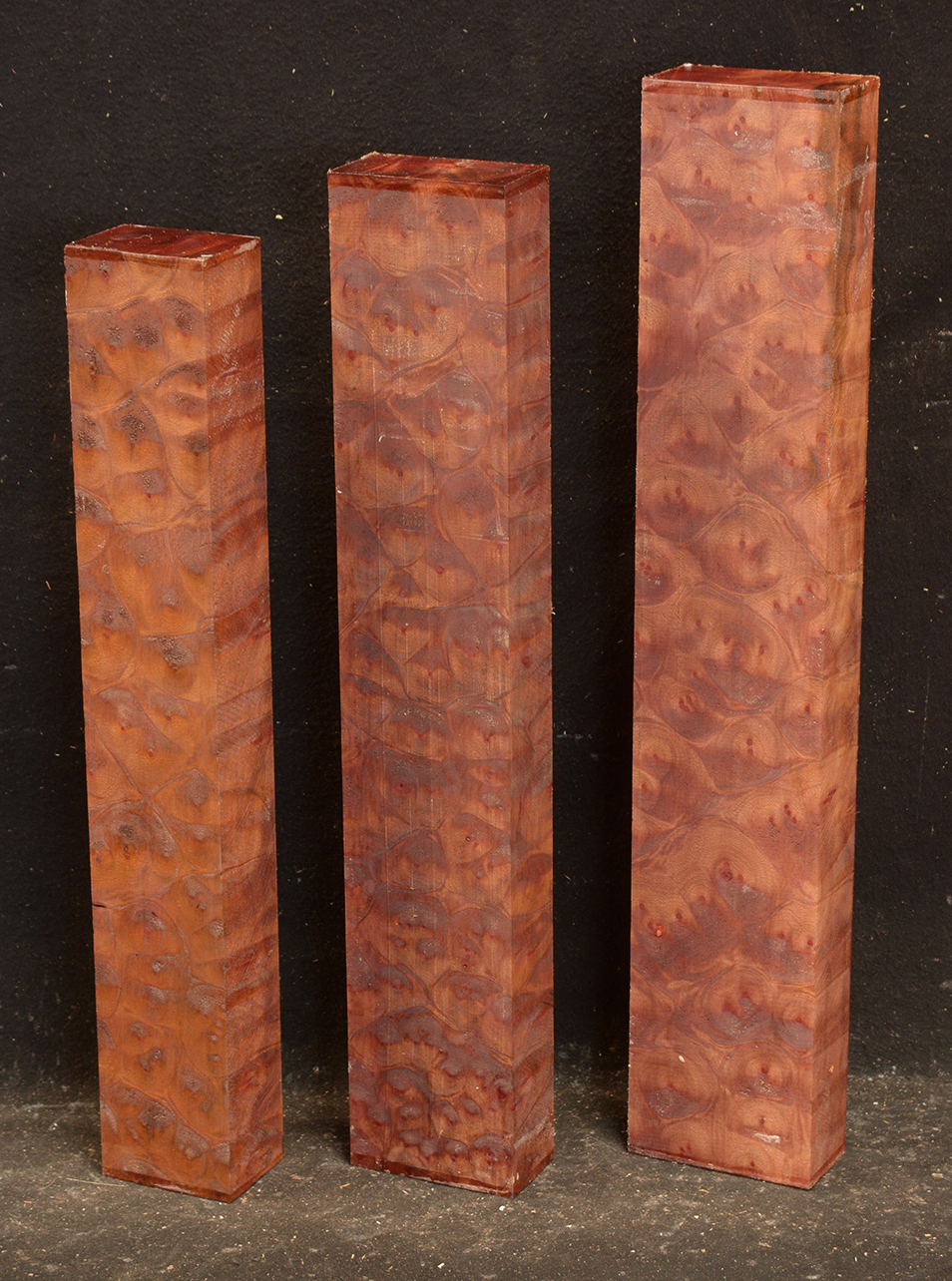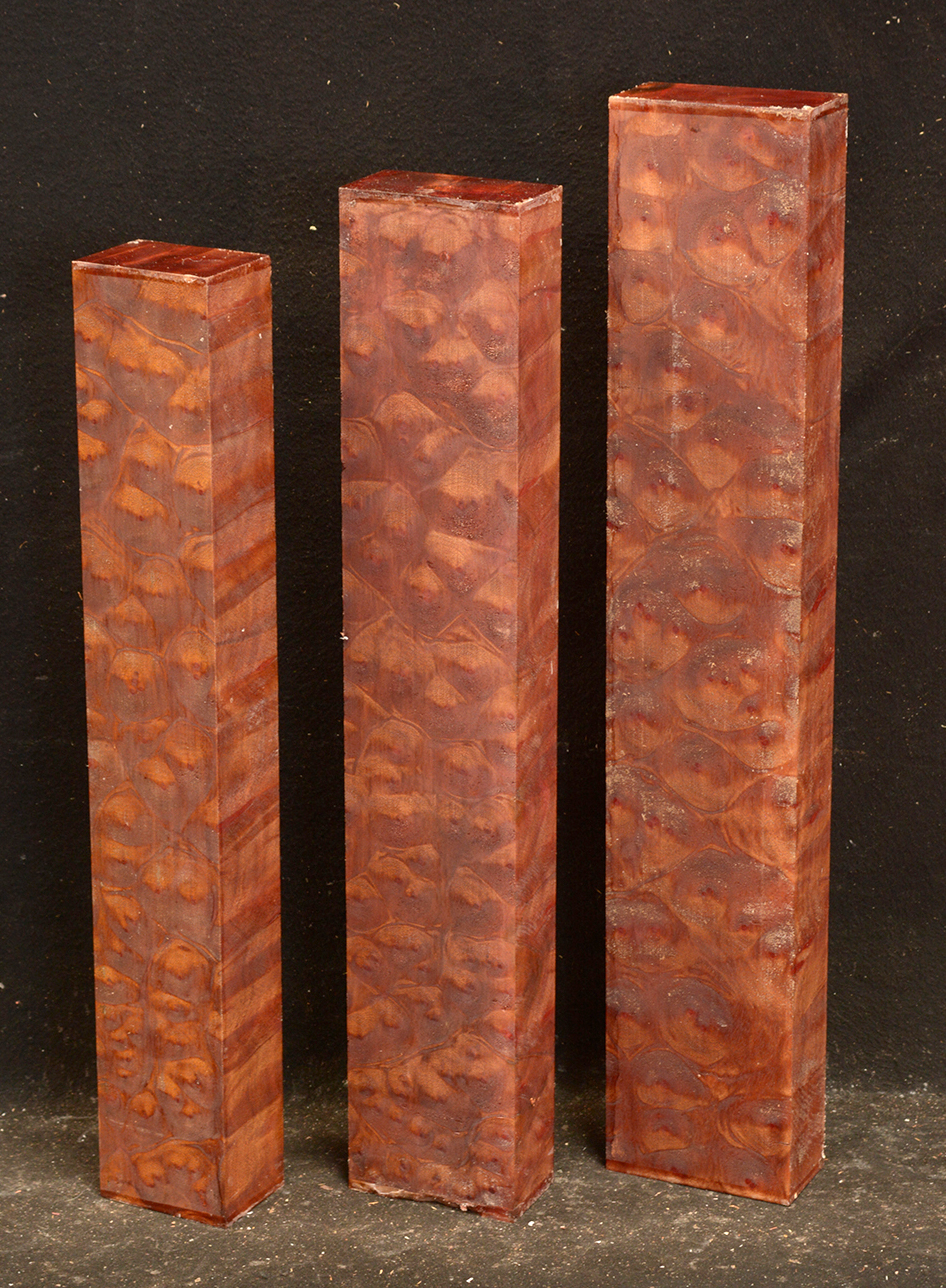 This rare burl is from S.E. Asia and is seldom seen on the world market. It is fine-grained and varies in color from a light reddish-brown to almost scarlet. It is easy to work and has a very pungent, spicy scent. For a burl it is remarkably stable. Green to partially air dried.