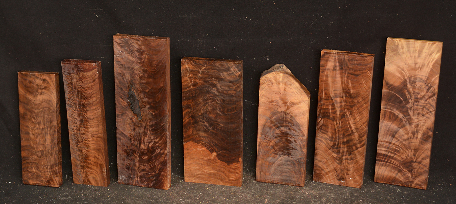 A tree found in Southern Oregon and Northern California with the best material coming from the San Joaquin Valley. Lighter in color than Eastern Black Walnut (Juglans regia) it is often found with curly and quilted figure. Burly stumps are also a valuable source of wood for veneers, gunstocks, and wood turning blanks.