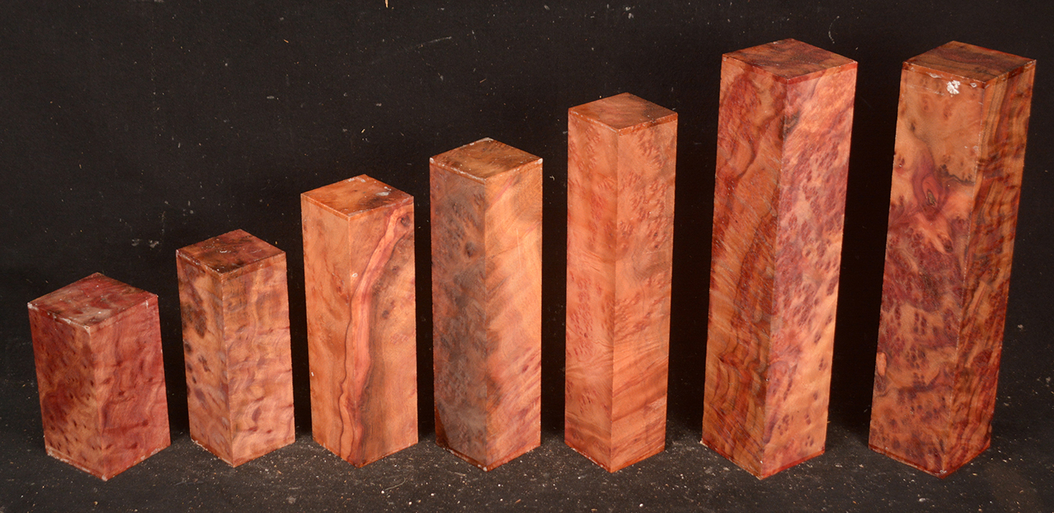 This rare burl is from S.E. Asia and is seldom seen on the world market. It is fine-grained and varies in color from a light reddish-brown to almost scarlet. It is easy to work and has a very pungent, spicy scent. For a burl it is remarkably stable. Green to partially air dried.