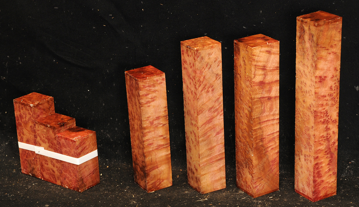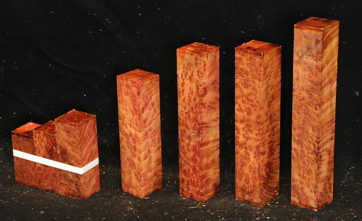 This rare burl is from S.E. Asia and is seldom seen on the world market. It is fine-grained and varies in color from a light reddish-brown to almost scarlet. It is easy to work and has a very pungent, spicy scent. For a burl it is remarkably stable. Green to partially air dried.
