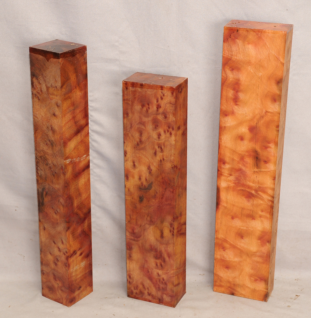 This rare burl is from S.E. Asia and is seldom seen on the world market. It is fine-grained and varies in color from a light reddish-brown to almost scarlet. It is easy to work and has a very pungent, spicy scent. For a burl it is remarkably stable. Green to partially air dried.