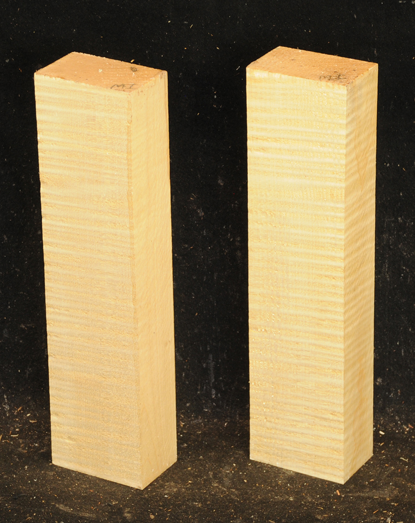 This European Maple is native to central Europe and west Asia. It is a tough, white or cream colored, fine-grained timber. It reminds me of vanilla ice cream because it is so even-colored. It works well in any grain direction. It is used for musical instruments, furniture, cabinetry, and because it is non-staining it is used for kitchen utensils, wooden spoons, rolling pins, and cutting boards. The figure is fiddleback on the quartersawn surface and more of a broken curl on the flatsawn surface. Select, quartersawn material is used for violin backs and sides and necks. Dry.