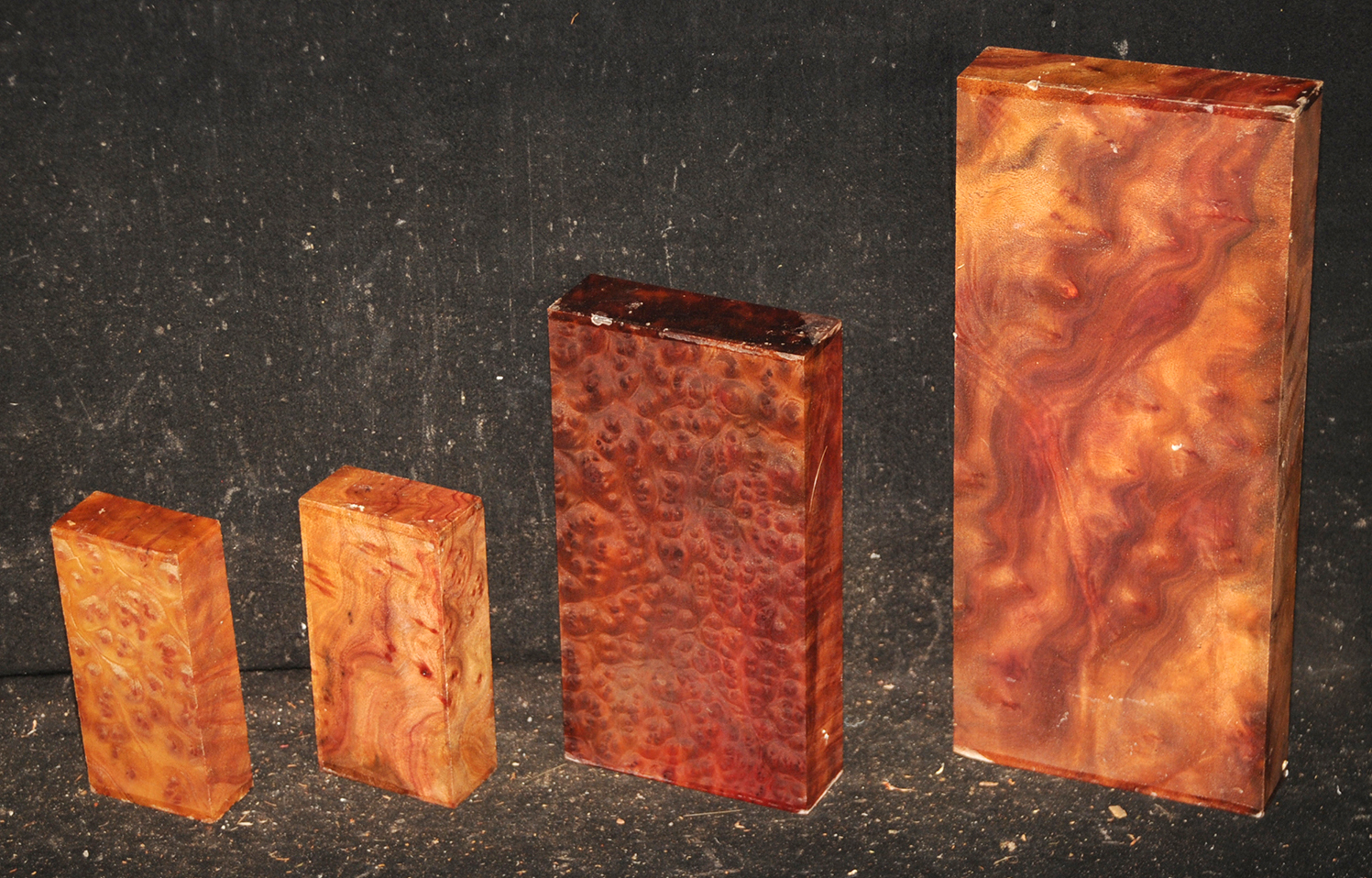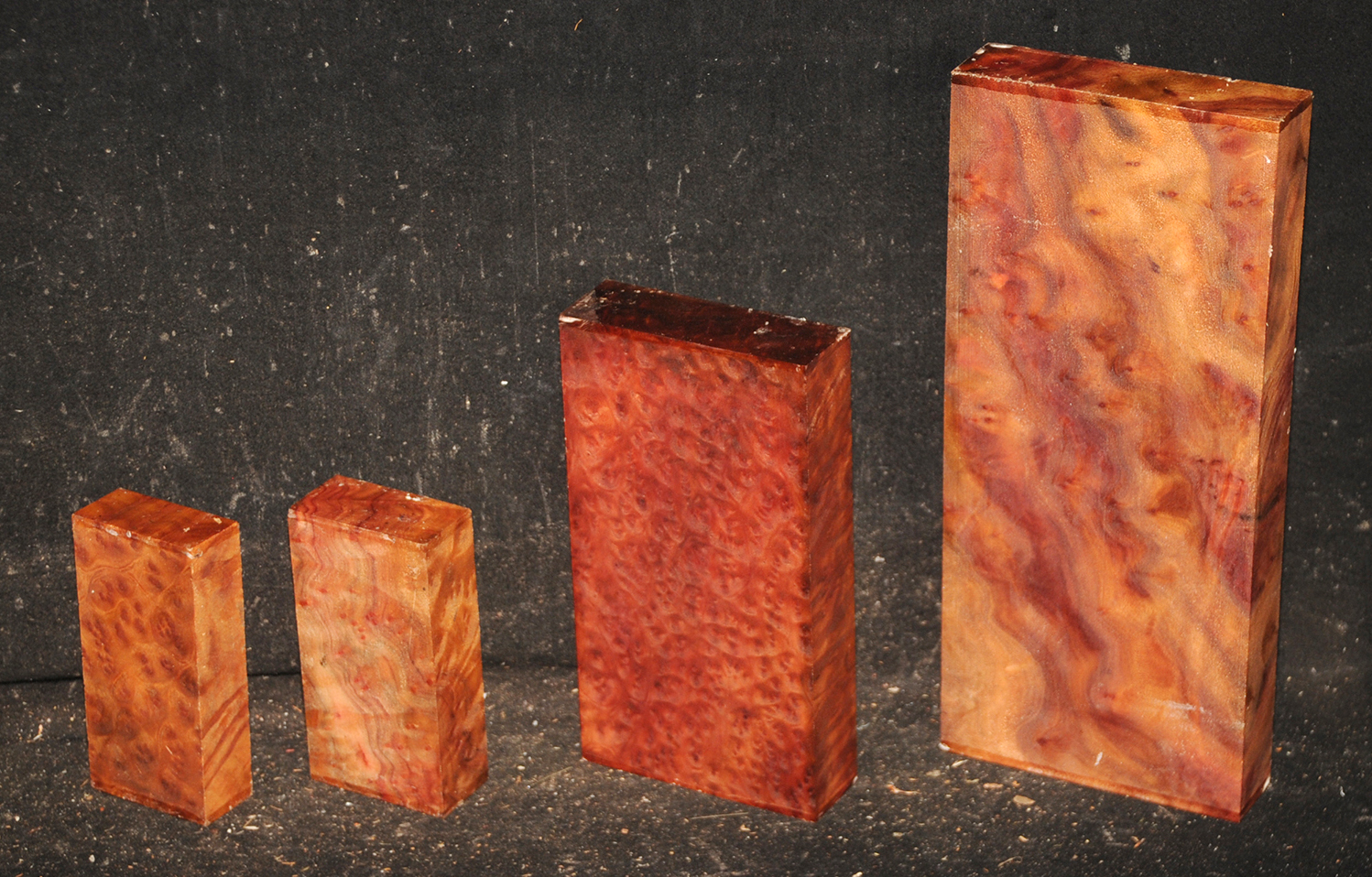 This rare burl is from S.E. Asia and is seldom seen on the world market. It is fine-grained and varies in color from a light reddish-brown to almost scarlet. It is easy to work and has a very pungent, spicy scent. For a burl it is remarkably stable. Green to partially air dried.