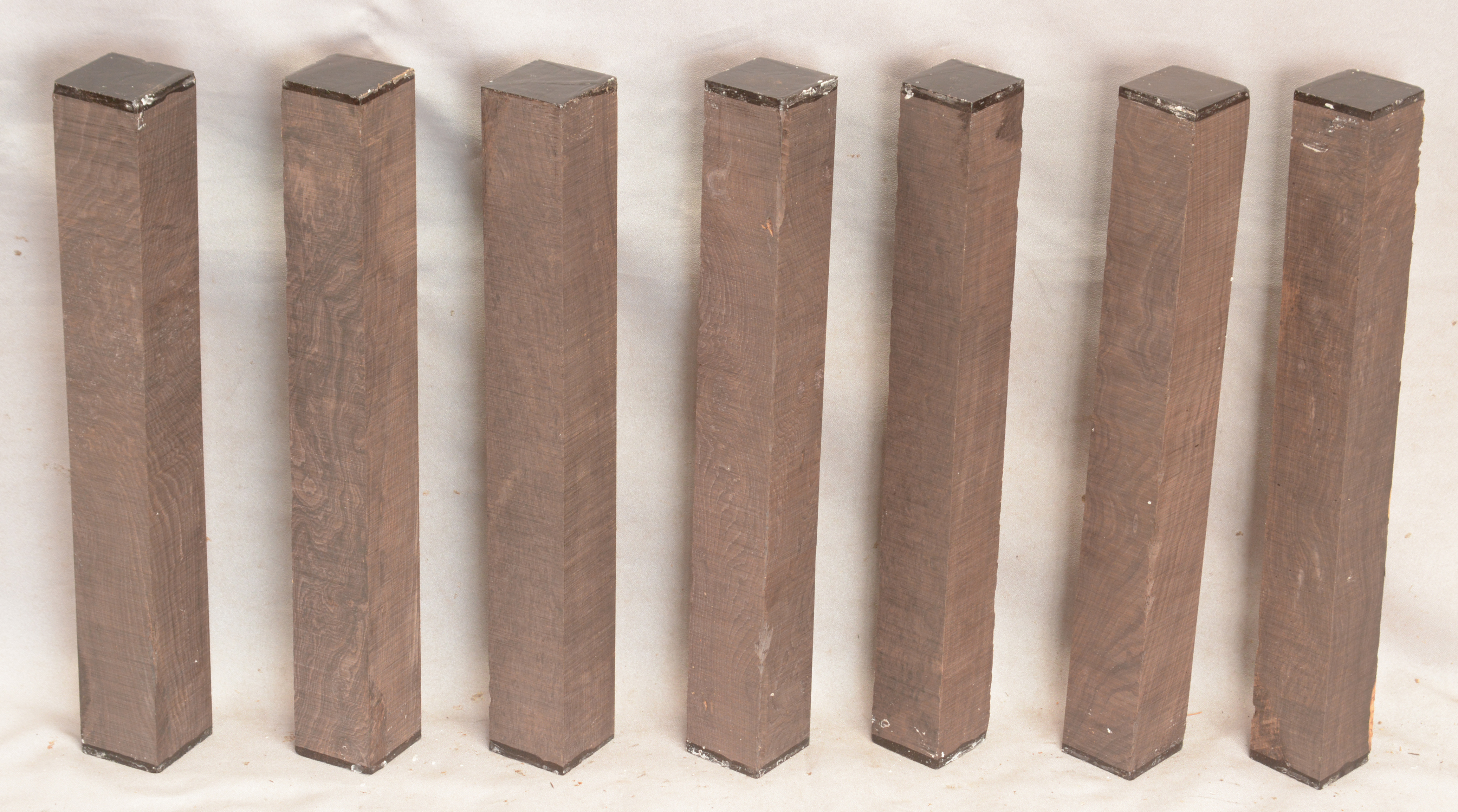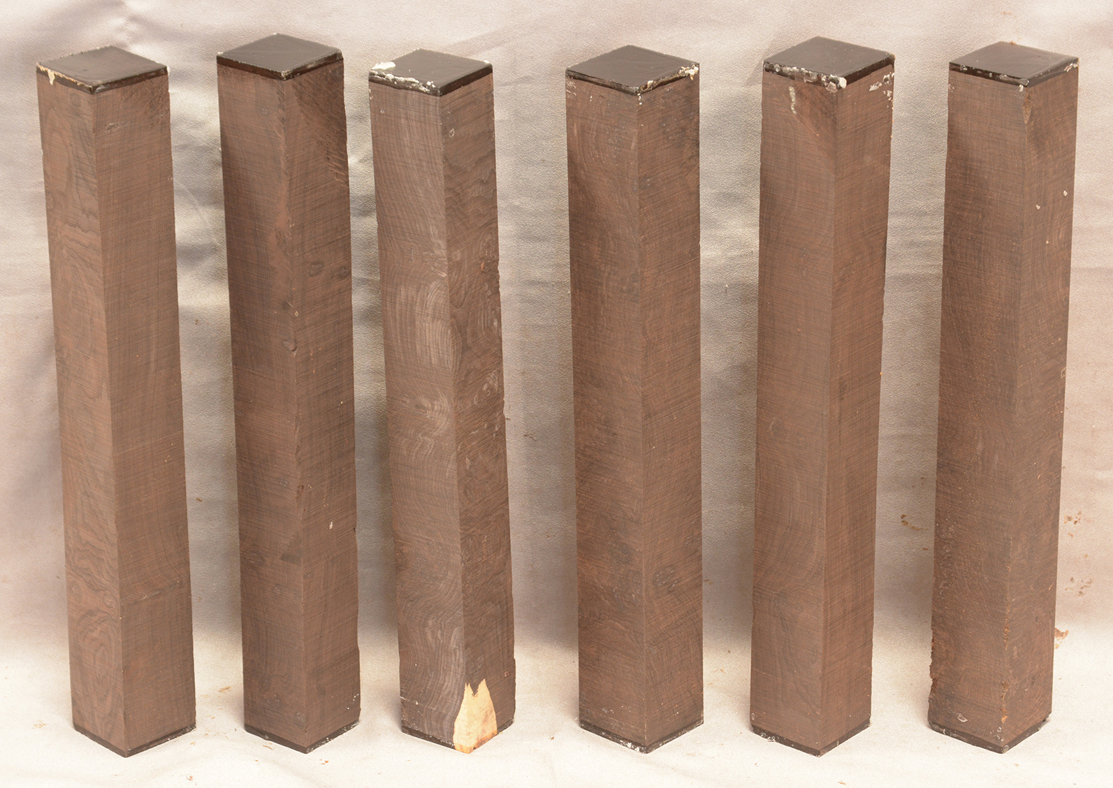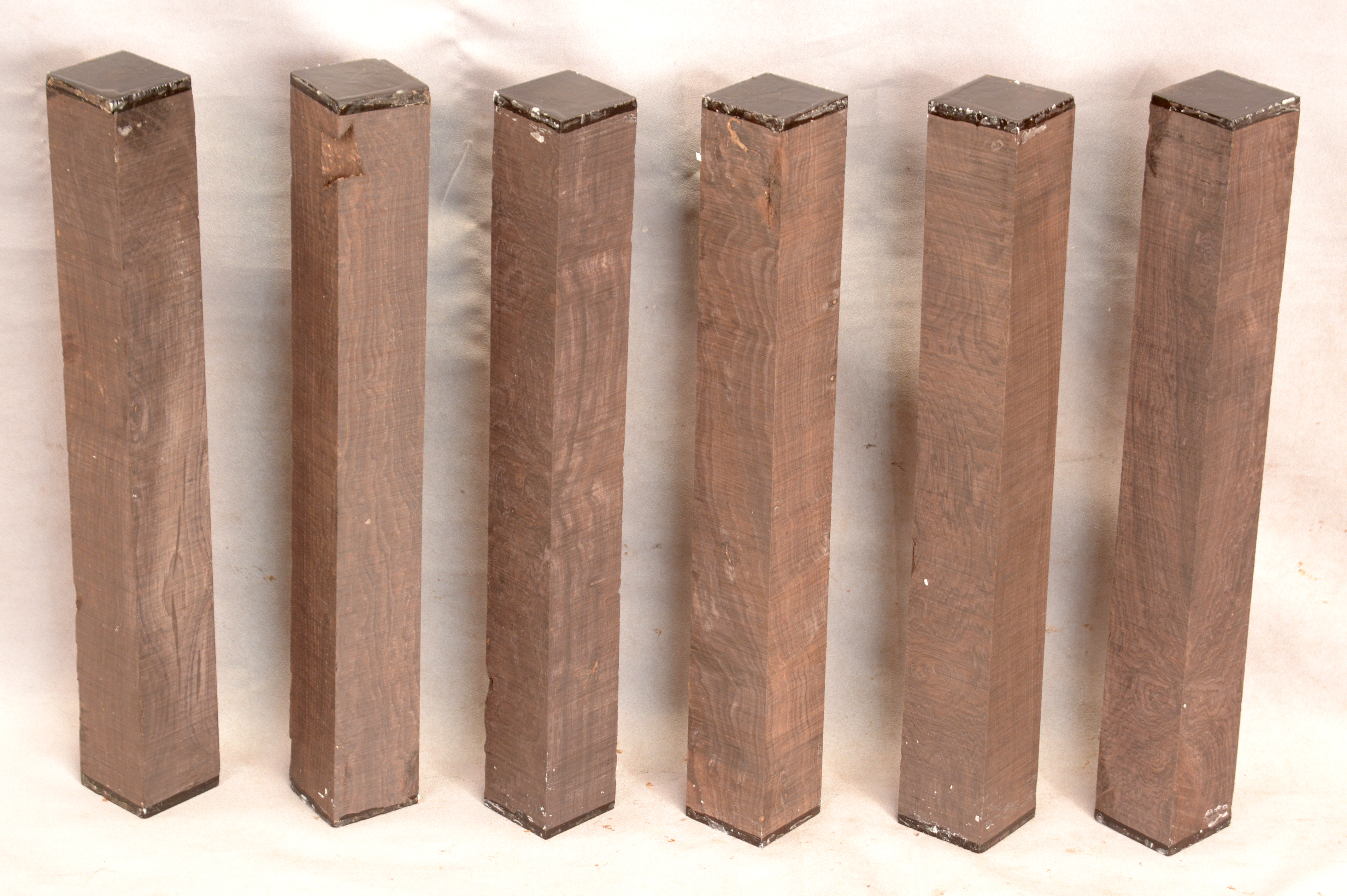 The heartwood is purplish to brownish-black with dark gray streaks giving an overall impression of being black. Lustrous with an attractive inner chatoyance. Very hard, heavy, close-grained, and virtually free from pores. Slightly oily to the touch. The sapwood is straw colored to a bright yellow and can be as wide as 2". African Blackwood can weigh as much as 85 lbs per cubic foot. It is used for marquetry, inlays, knife handles, game calls, pistol grips, pool cue butts, chess pieces, jewelry, and other precious arts and crafts. But its main use is in turning, and it claims the title of the finest of turnery woods, well known as the standard by which other turnery woods are judged. Long a favorite of ornamental turners, the nature of the wood allows very fine detail with sharp cutters, leaving a beautiful, burnished surface. Its stability, oily nature, resistance to moisture, and lovely finishing qualities make it superior to other timbers. These are best quality squares. Rare.