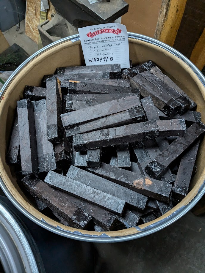 We have in stock a large quantity of African Blackwood or Grenadillo squares from East Africa. They are all roughsawn just as the mill produced them and range in size from approximately 1 3/8 x 1 3/8 up to 1 5/8 x 1 5/8 with lengths of between 7 and 15 inches. Some squares may have sapwood corners, burly or wild grain, occasional bug holes, or small inclusions, i.e. they have the small defects common to Blackwood. I have milled thousands of these and have produced beautiful turning squares with many of them instrument-quality. They arrive in bags weighing between 60 and 70 lbs. Buy a bag and save $$$. We will kick out any that are too defected and box up 60 pieces for $480. That is only $8 per piece. For larger quantities call us for prices.