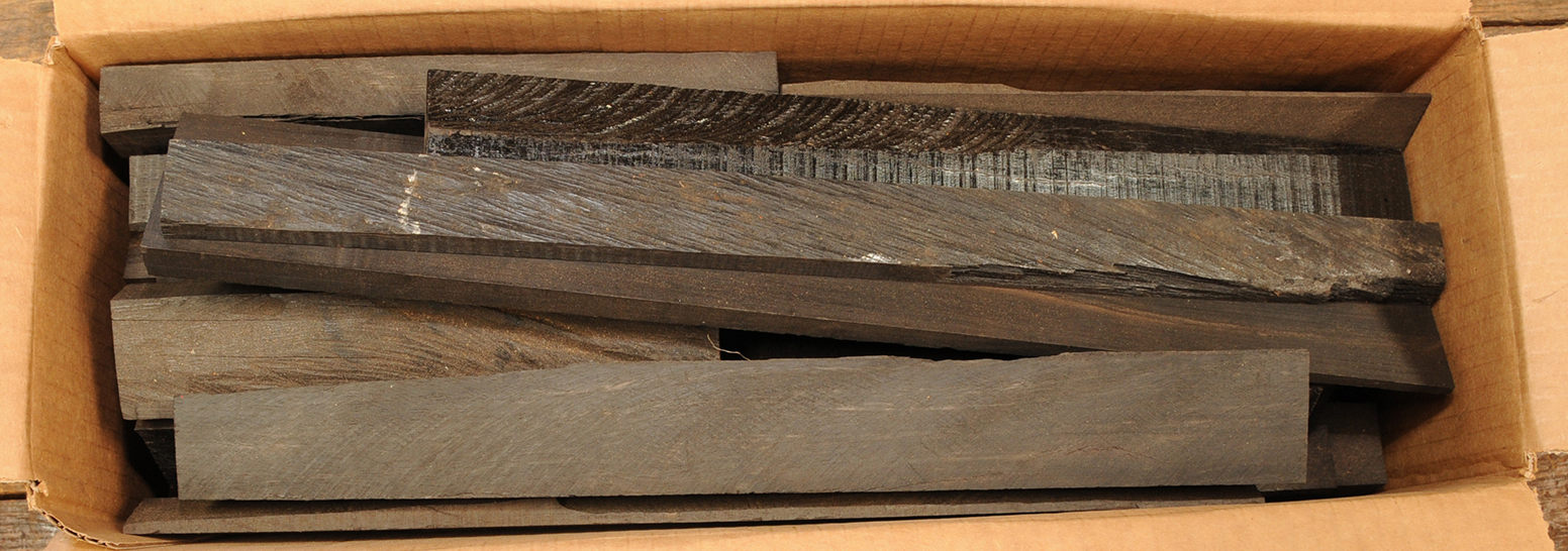 Sometimes called Gabon or Gaboon, this Ebony is sometimes jet black but oftentimes has grayish streaks that mostly disappear when finished or after the made object has been put into service. This Ebony has a marked resistance to checking that is characteristic of some of the Indian and Asian species. It has a wonderful texture and is easily carved, planed, turned, and milled. It is fairly fine-grained and takes a high polish. This Ebony usually originates in either Cameroon or Nigeria and the logs are rough hewn in the forest and oftentimes brought to the nearest road by human porters. With the disappearance of other species of black Ebony this species is fast becoming the Ebony of choice.